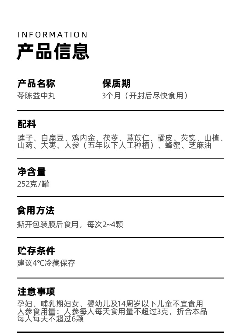 苓陈益中丸28颗 | 13味本草配方 | 莲子+白扁豆+鸡内金+茯苓+薏苡仁 | 山楂山药大枣人参 | 蜂蜜芝麻油调和 | 传统工艺制作,食养调理便携装