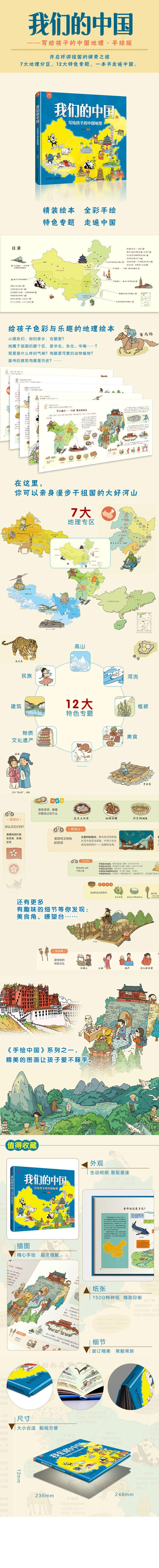 《我们的中国——写给孩子的中国地理·手绘版》是一本针对少年儿童阅读的中国地理人文知识类绘本。本书通过7大分区、12个专题的形式,涵盖了我国23个省、4个直辖市、5个自治区和2个特别行政区,用绘本的形式全貌性地呈现了各地的地质地貌、时区与气候、动物植被、交通美食、自然风光和文化遗产等。全书四色手绘,全彩印刷, 形象直观的手绘地图与精炼有趣的知识点,让小读者犹如亲身漫步于祖国的大好河山,一本书了解中国。