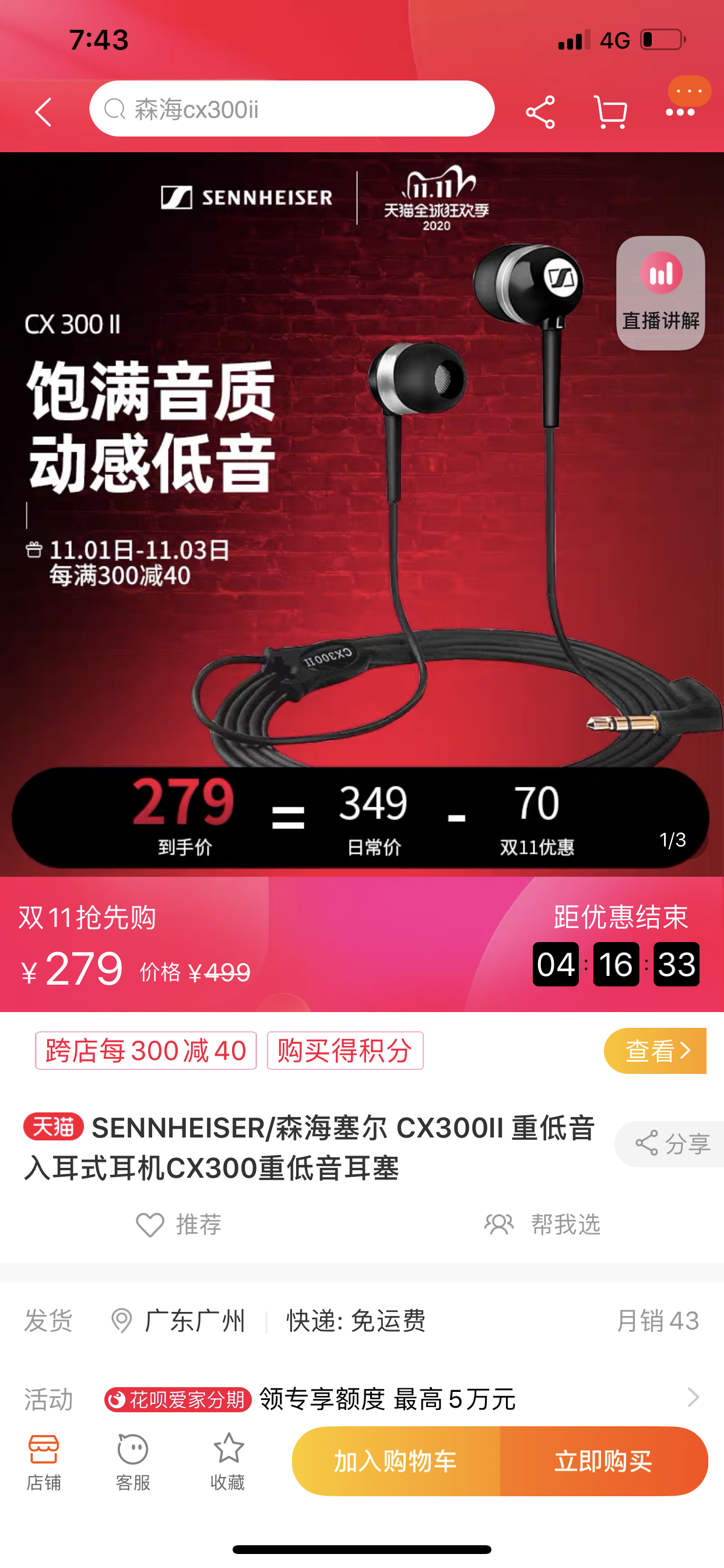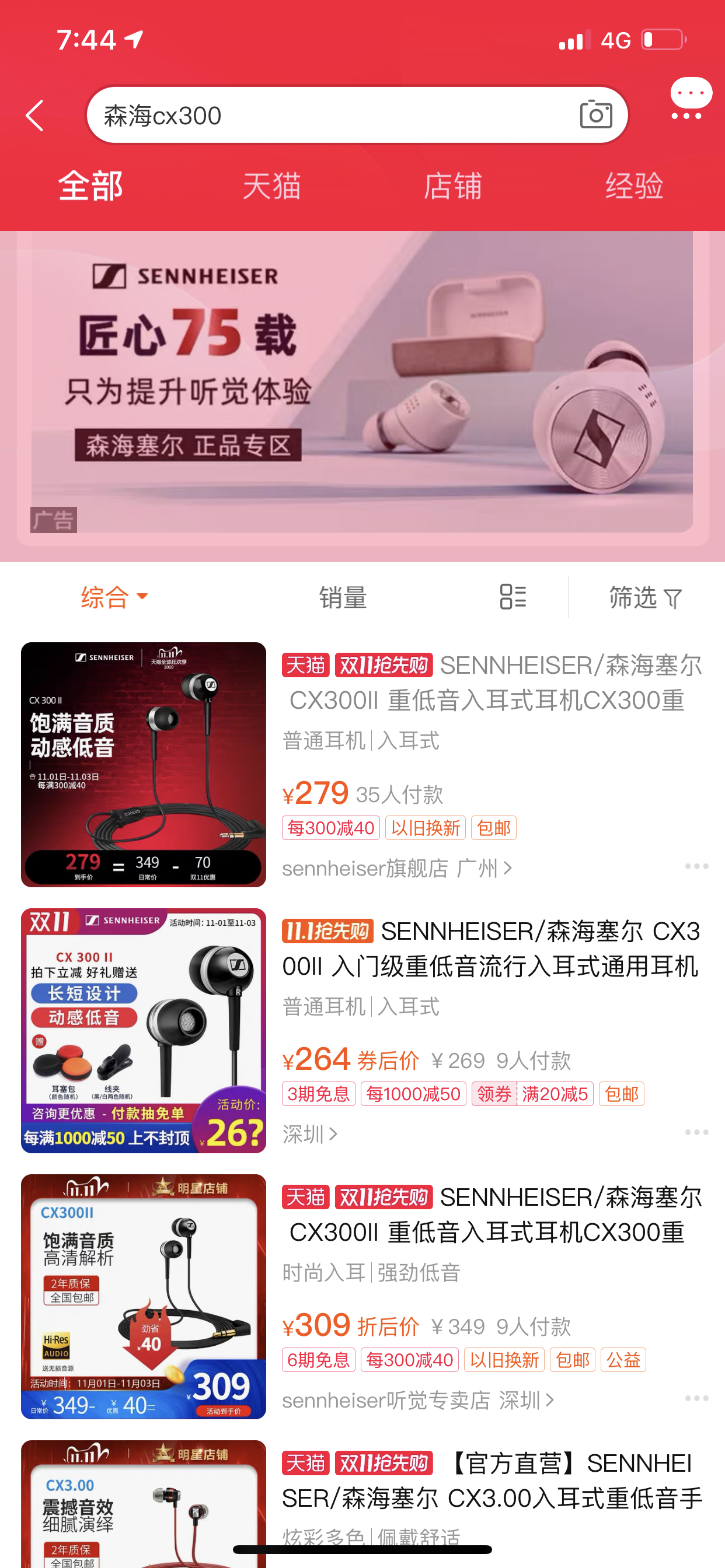 森海塞尔cx300 ii有线音乐耳机散装99新