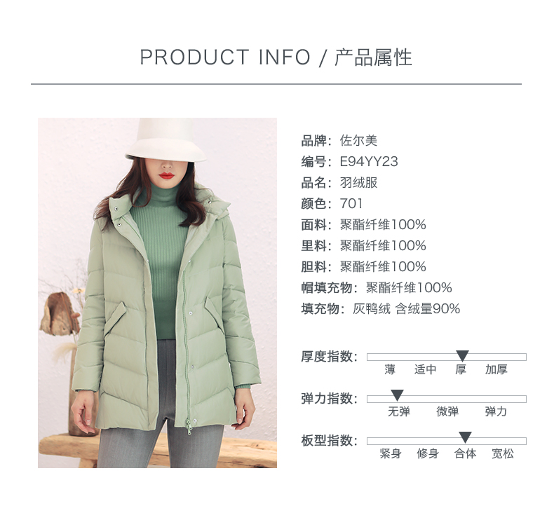 佐尔美秋冬新款商场同款加厚连帽双穿鸭绒中长款羽绒服女E04YY09