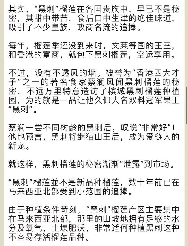 食神蔡澜吃过后这样形容:胜过猫山王“黑刺最好吃”。大赞“一定要亲自试过才知道”