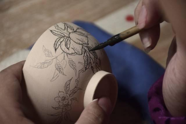 运用的是釉下彩的技法 釉下彩是将陶土固定成型进行干燥后 用钴土为主要成分的氧化钴料描绘 上色的瞬间,颜料就会被立刻吸收 所以需要画师具有极其精准的技术 将细致缜密的图案绘制也一气呵成