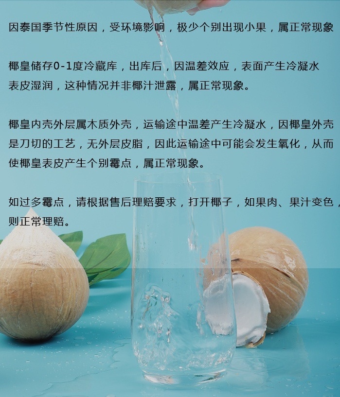 2.奶椰从冷库新鲜发出之后,由于夏天温度高产生温差,表面会产生冷凝水,比较湿润,这个不是椰汁外漏,不影响食用。