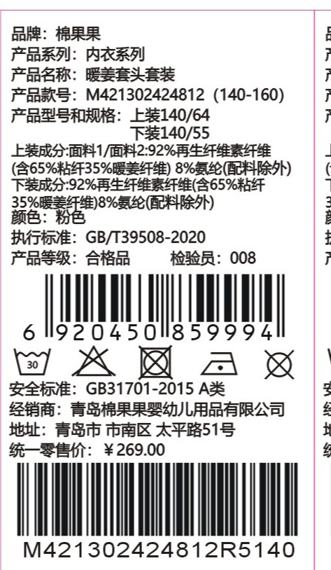 棉果果专柜同款冬季新品女童中大童大码暖姜套头套装M421302424812