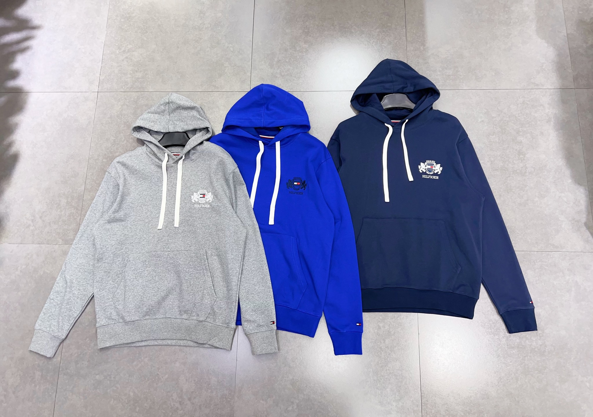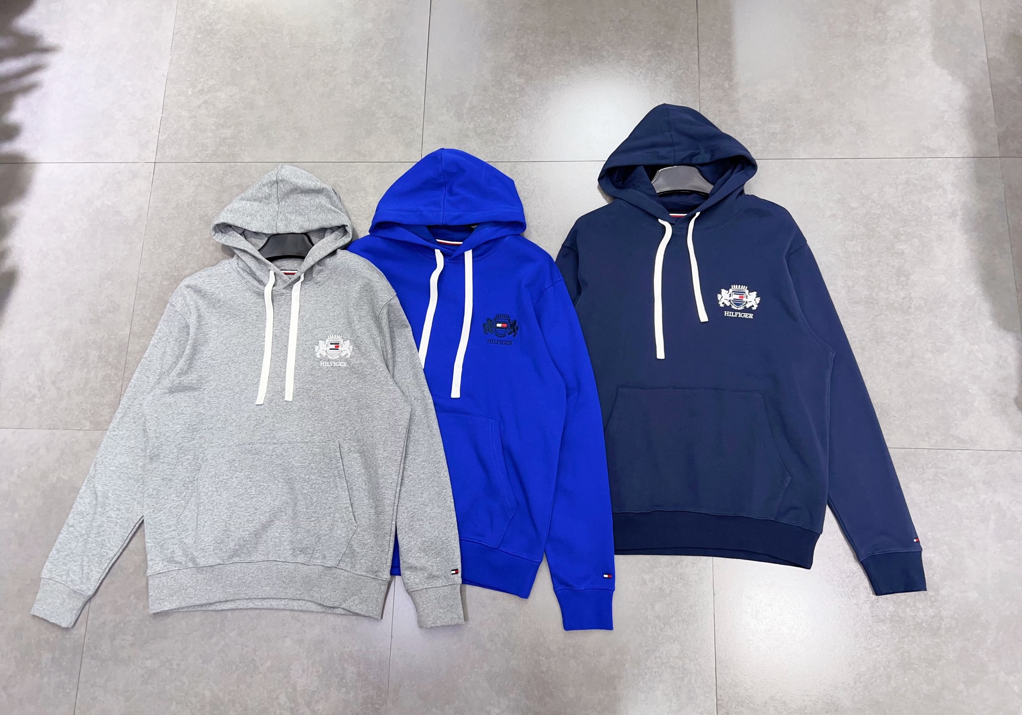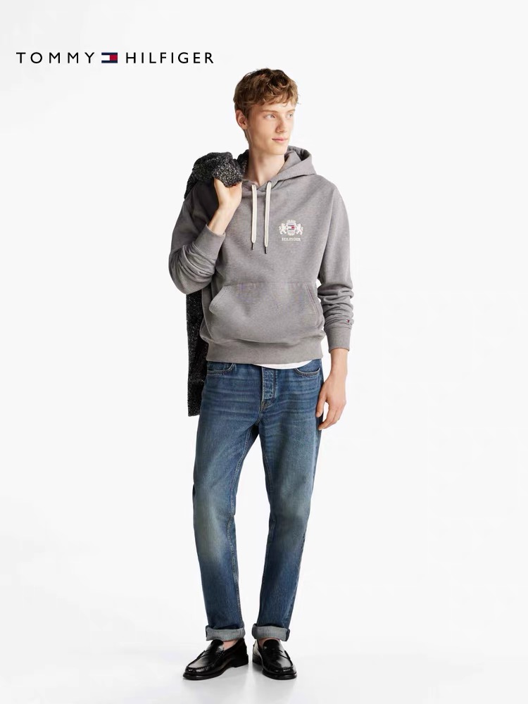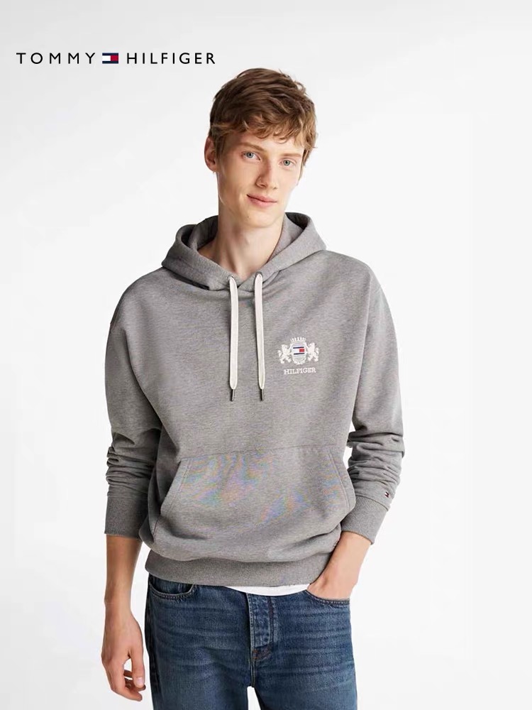 2025 Autumn Tommy 秋冬男装纯棉徽章刺绣美式复古宽松运动连帽卫衣 款号: TM- 9110# 颜色: 彩蓝 宝蓝 灰色 Size: M L XL XXL