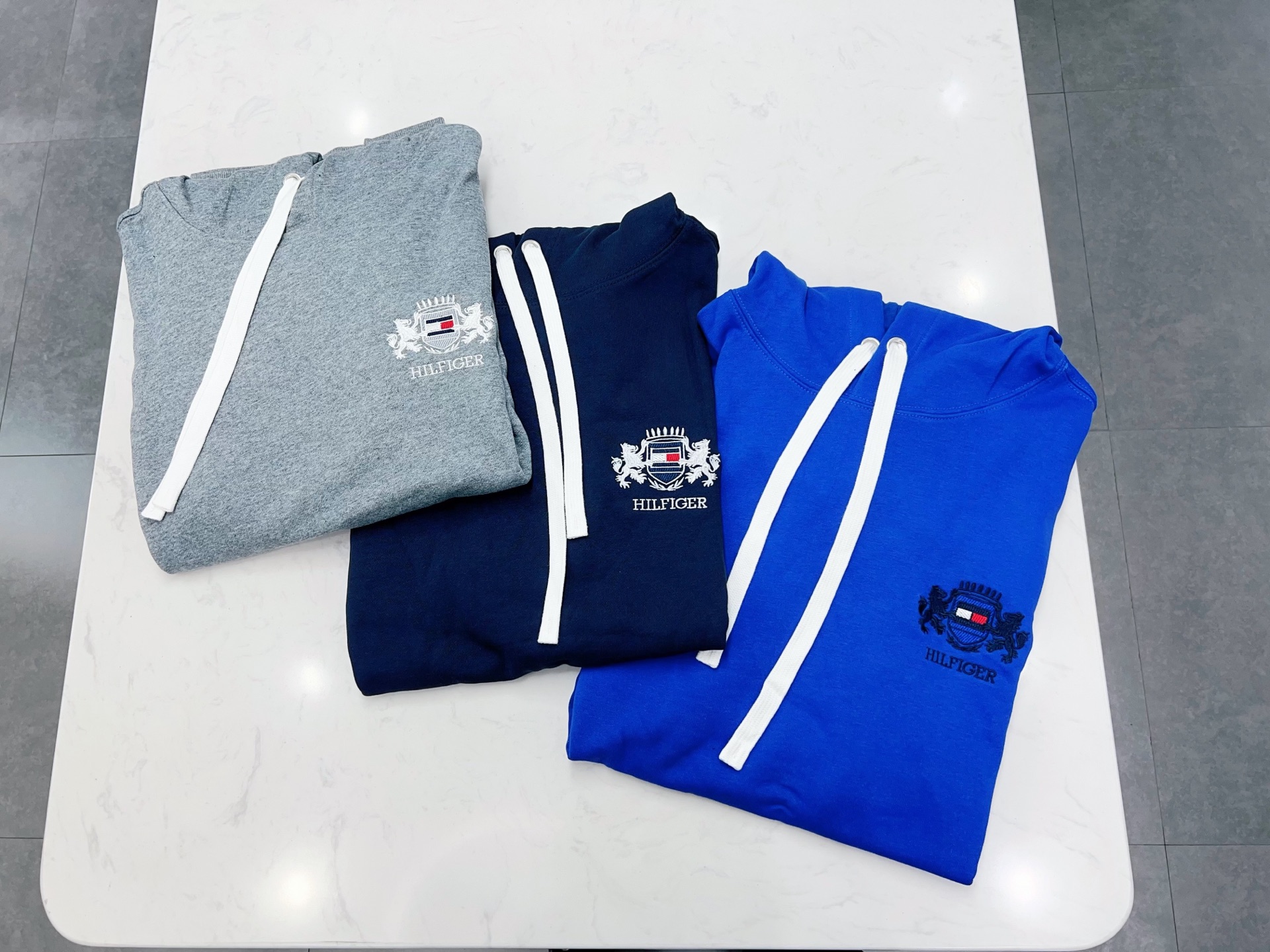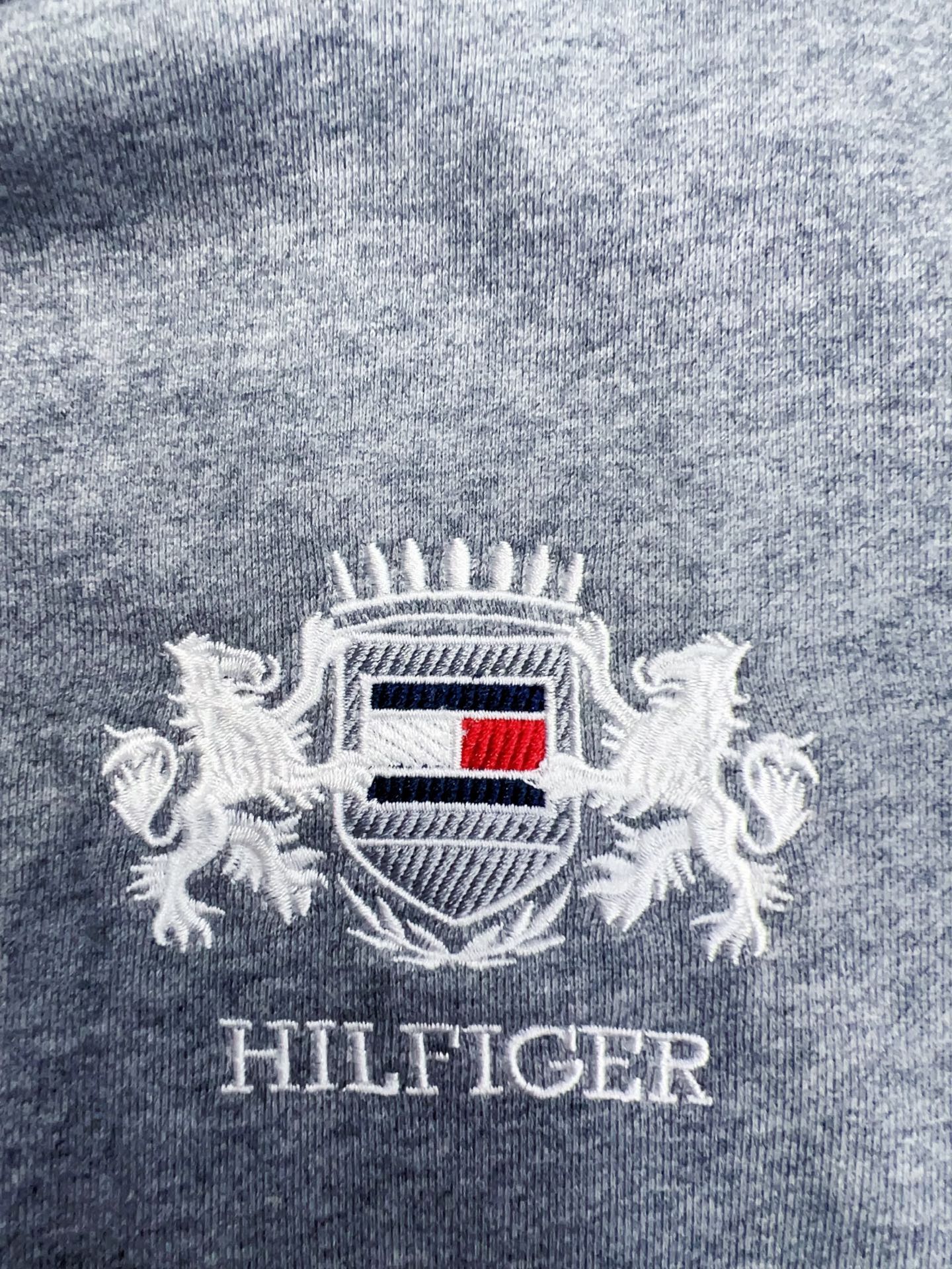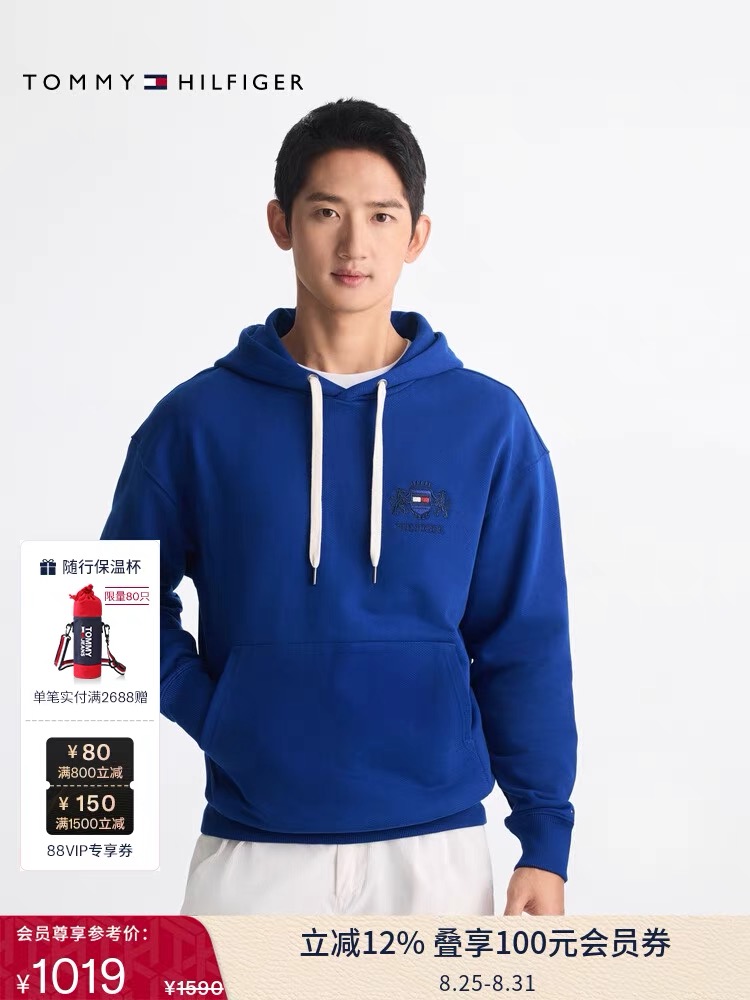 2025 Autumn Tommy 秋冬男装纯棉徽章刺绣美式复古宽松运动连帽卫衣 款号: TM- 9110# 颜色: 彩蓝 宝蓝 灰色 Size: M L XL XXL