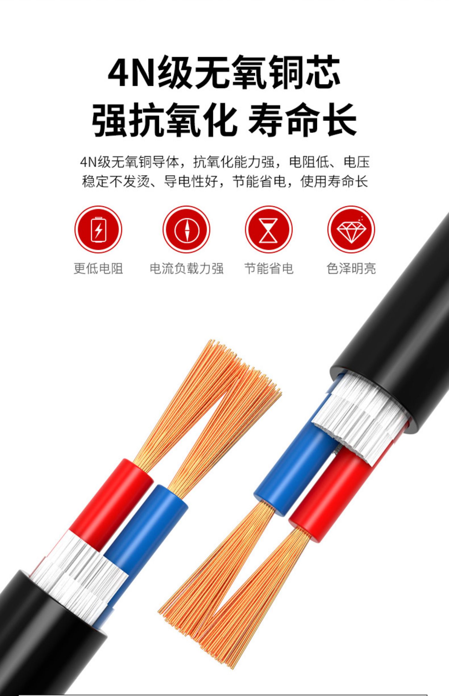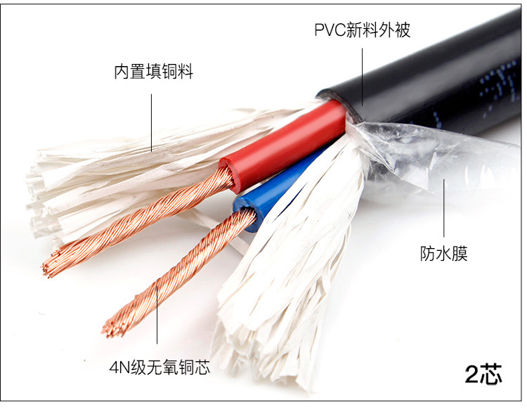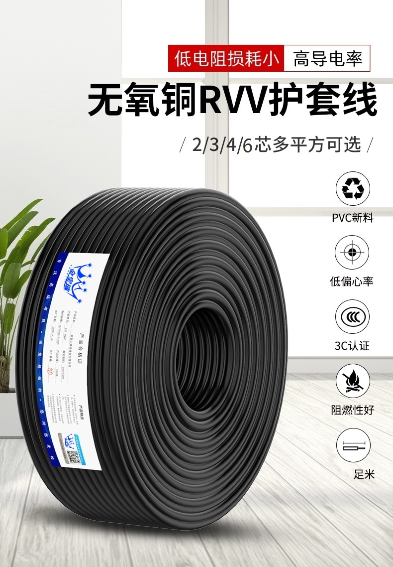 爆款 工程级【无氧铜@足米】RVV电线软电缆线2芯3芯4芯0.5 0.75 1.0 1.5 2.5平方铜芯电源线电线 护套线家用连接户外监控电源线电缆线抄表消防电气连接供电线