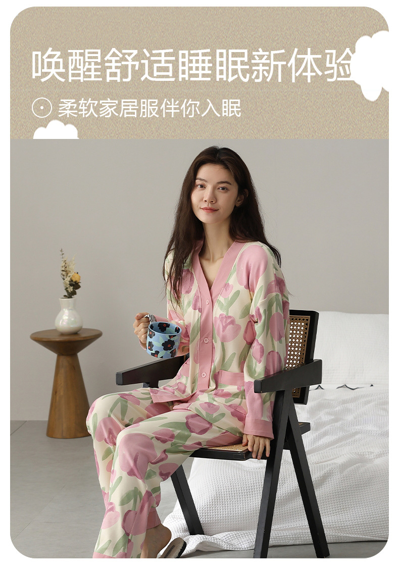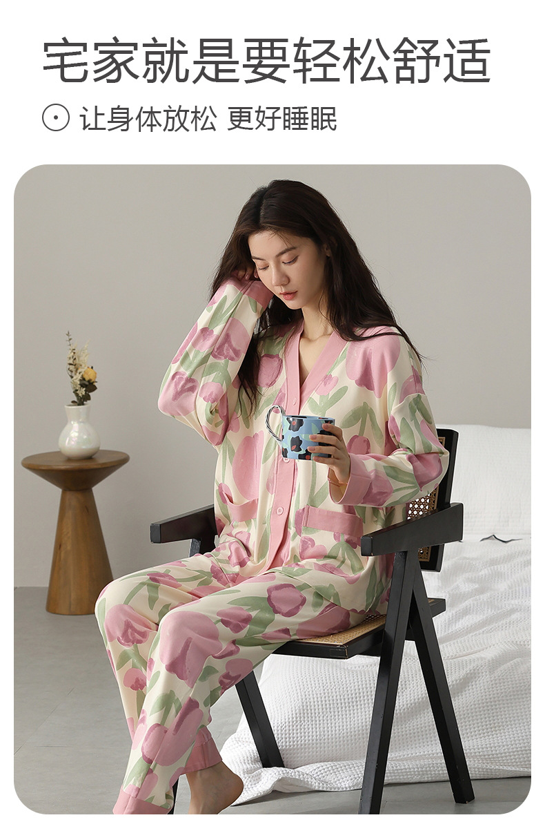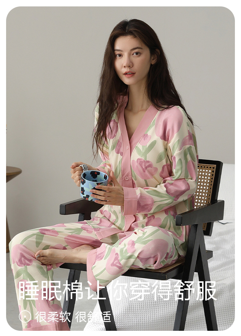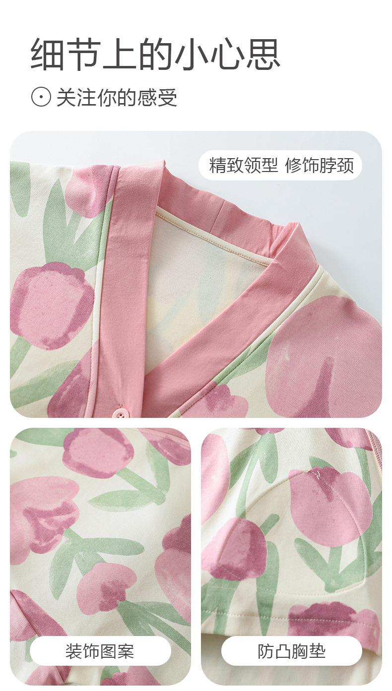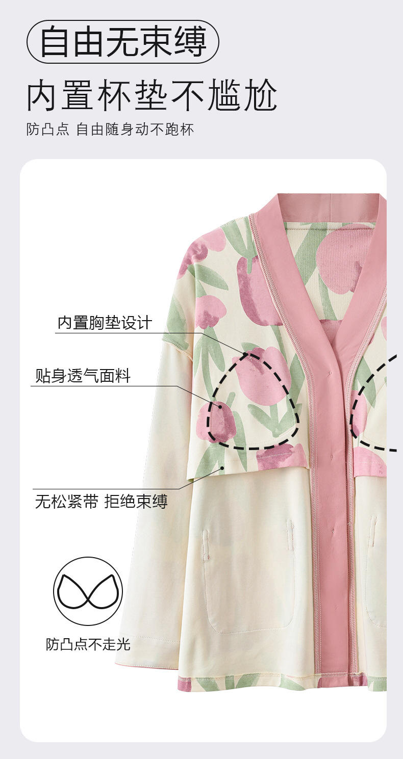 春秋季【开衫睡衣带胸垫】长袖长裤免穿文胸 优质棉家居服 V领和服睡衣