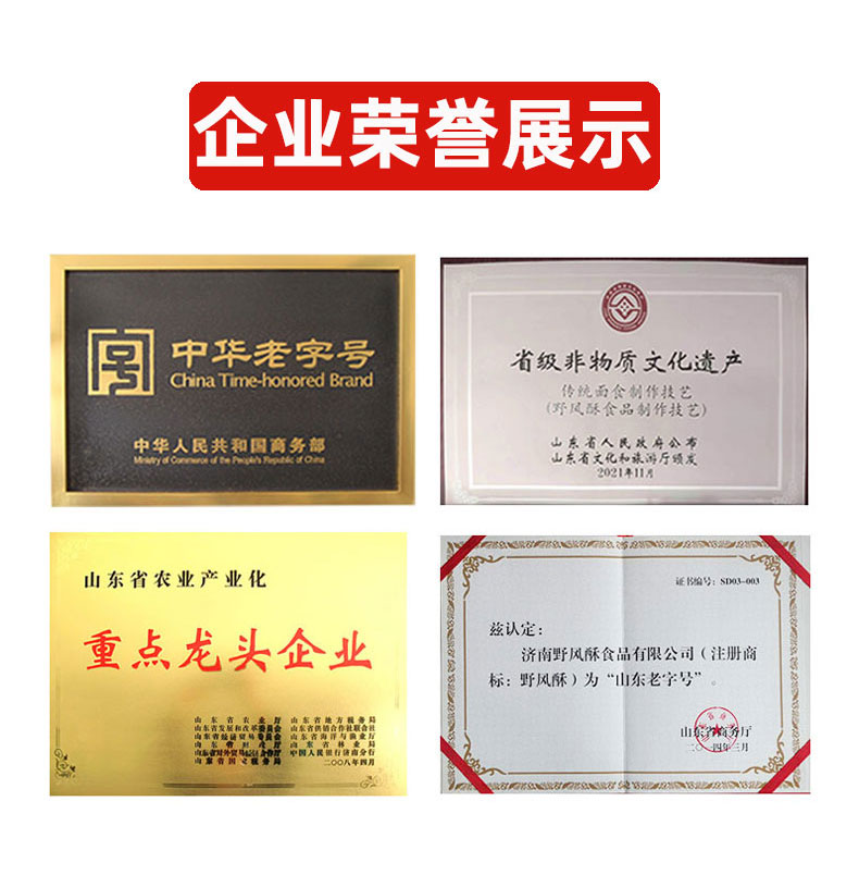 - 济南野风酥食品有限公司是一家从事绿色无公害农产品深加工,生产山东特产食品的企业。职工总人数586人,其中高中级技术人员56人。2007年济南野风酥食品有限公司被山东省人民政府授予省级农业产业化经营重点龙头企业。我公司生产的糖酥煎饼等系列产品曾连续获农业部、山东省优质产品奖,被人民大会堂定为国宴用品。“九顶塔”牌商标获得“省优”“部优”商标称号。全国著名的营养学家于若木曾来厂视察并亲笔题词,姜春云、苏毅然等国家、省级领导先后来厂视察。“野风酥”被中国食品协会评为“优秀民族食品”,获得“中华名吃”称号。产品连续获得国家级食品展销会的畅销产品奖,成为山东省的特色食品,省、市旅游局的十佳旅游商品。“山东煎饼”和“山东烧饼” 被认证为绿色食品。