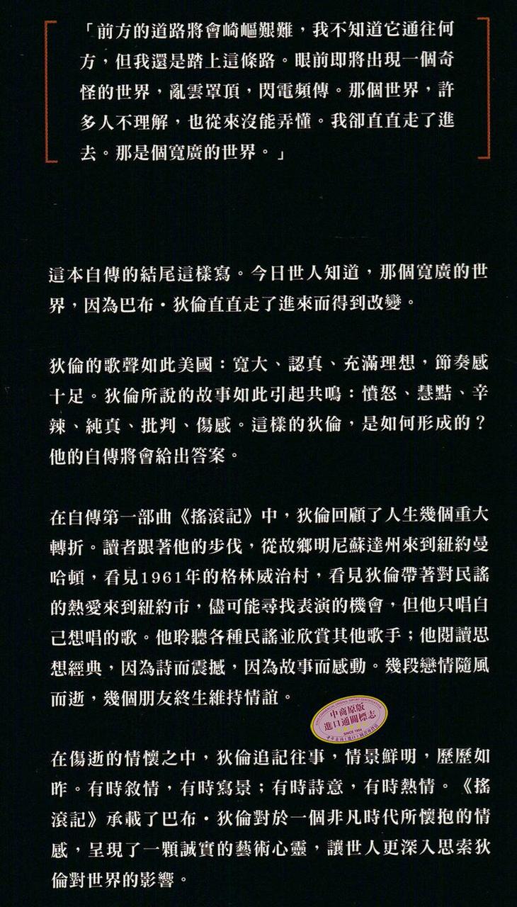 「前方的道路將會崎嶇艱難,我不知道它通往何方,但我還是踏上這條路。眼前即將出現一個奇怪的世界,亂雲罩頂,閃電頻傳。那個世界,許多人不理解,也從來沒能弄懂。我卻直直走了進去。那是個寬廣的世界。」這本自傳的結尾這樣寫。今日世人知道,那個寬廣的世界,會因為巴布.狄倫直直走了進來而得到改變。