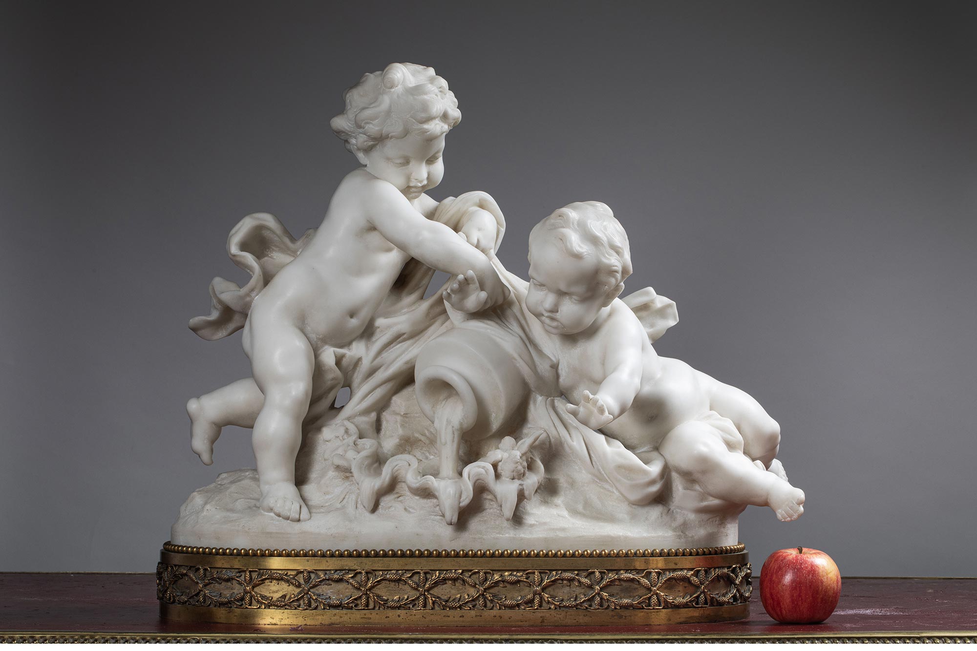 独角鹿西洋古董 19世纪法国著名雕塑家Jean-Jules Salmson签名创作小天使主题铜鎏金底座大理石雕塑作品《泉》