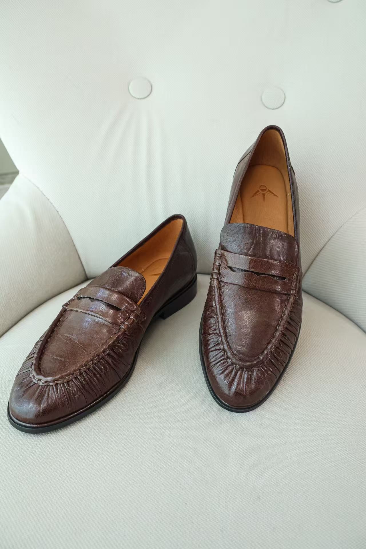 老钱极简褶皱真皮乐福鞋