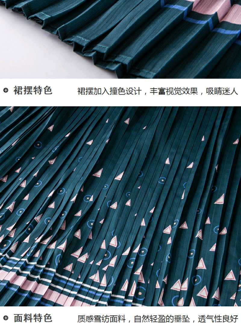 欧芮儿女 新款收腰显瘦百搭印花雪纺百褶半身裙女中长款