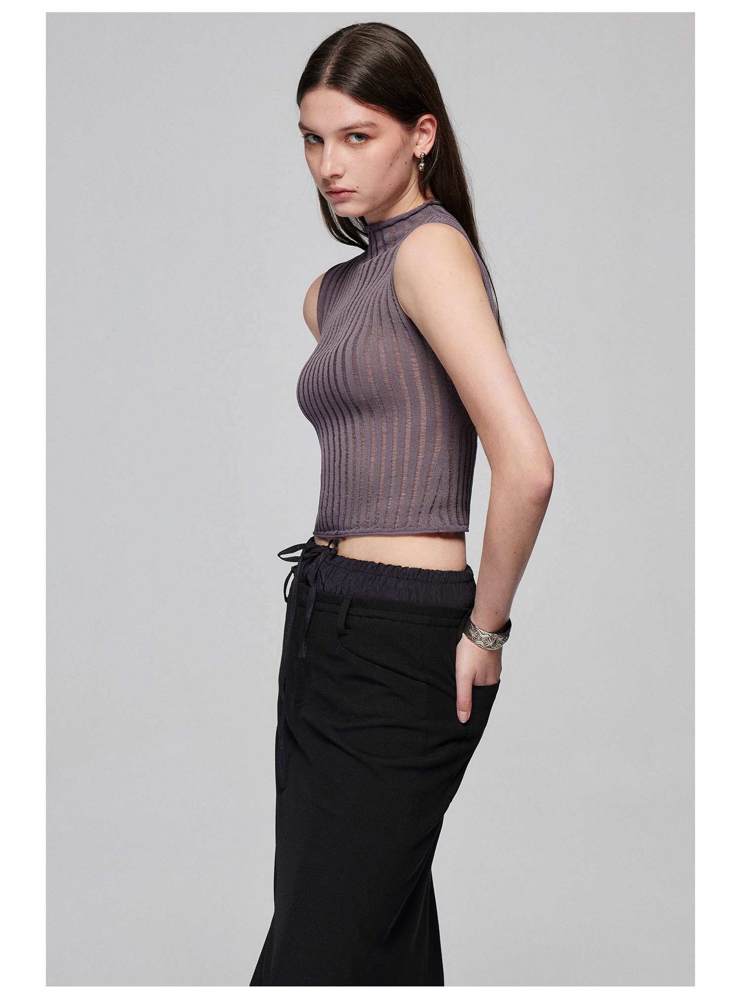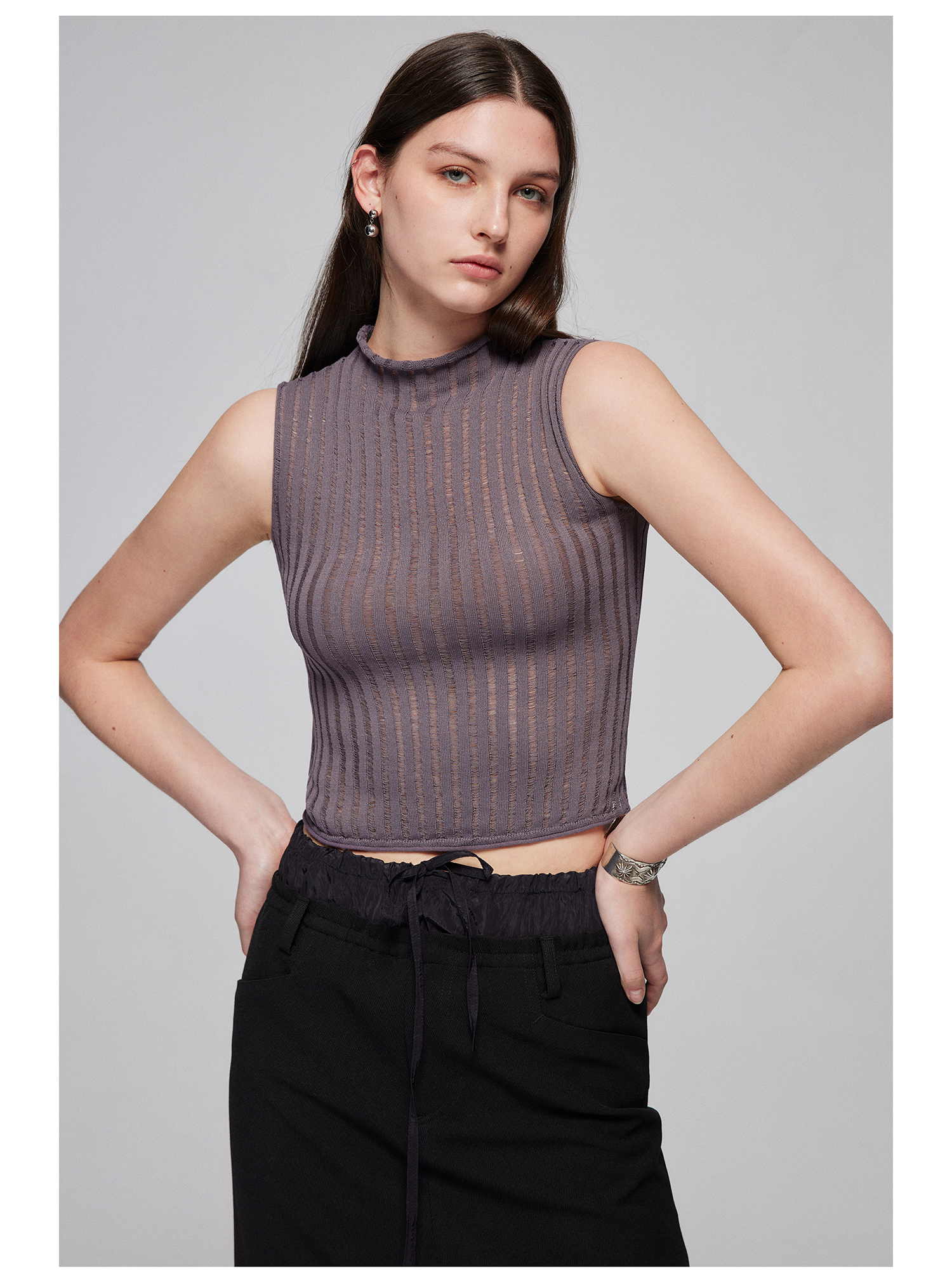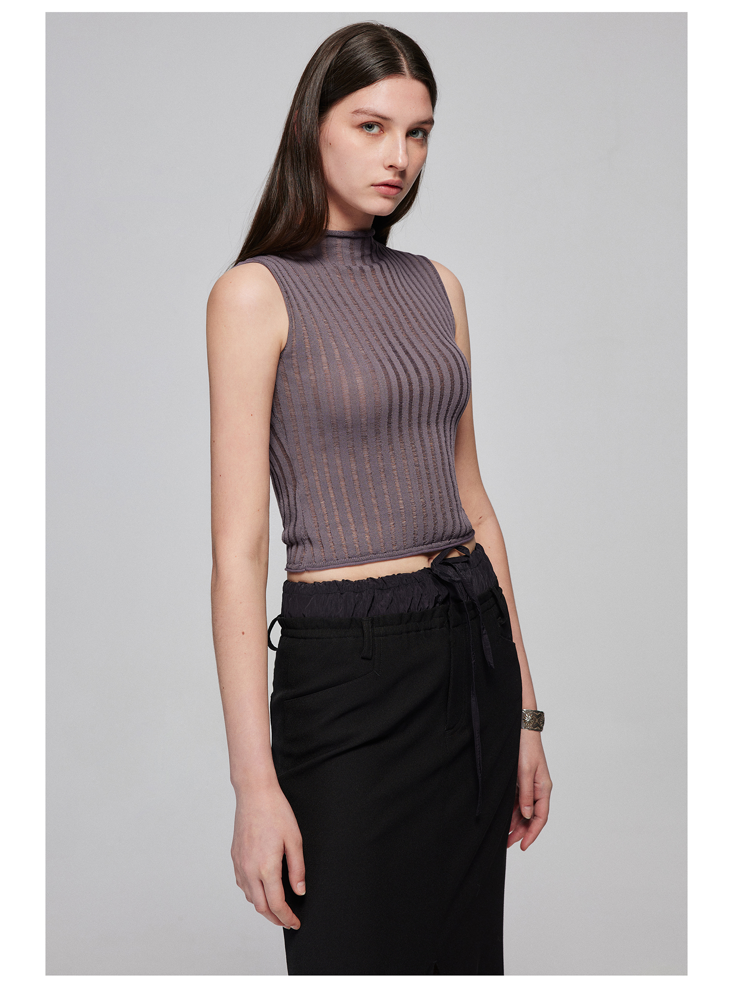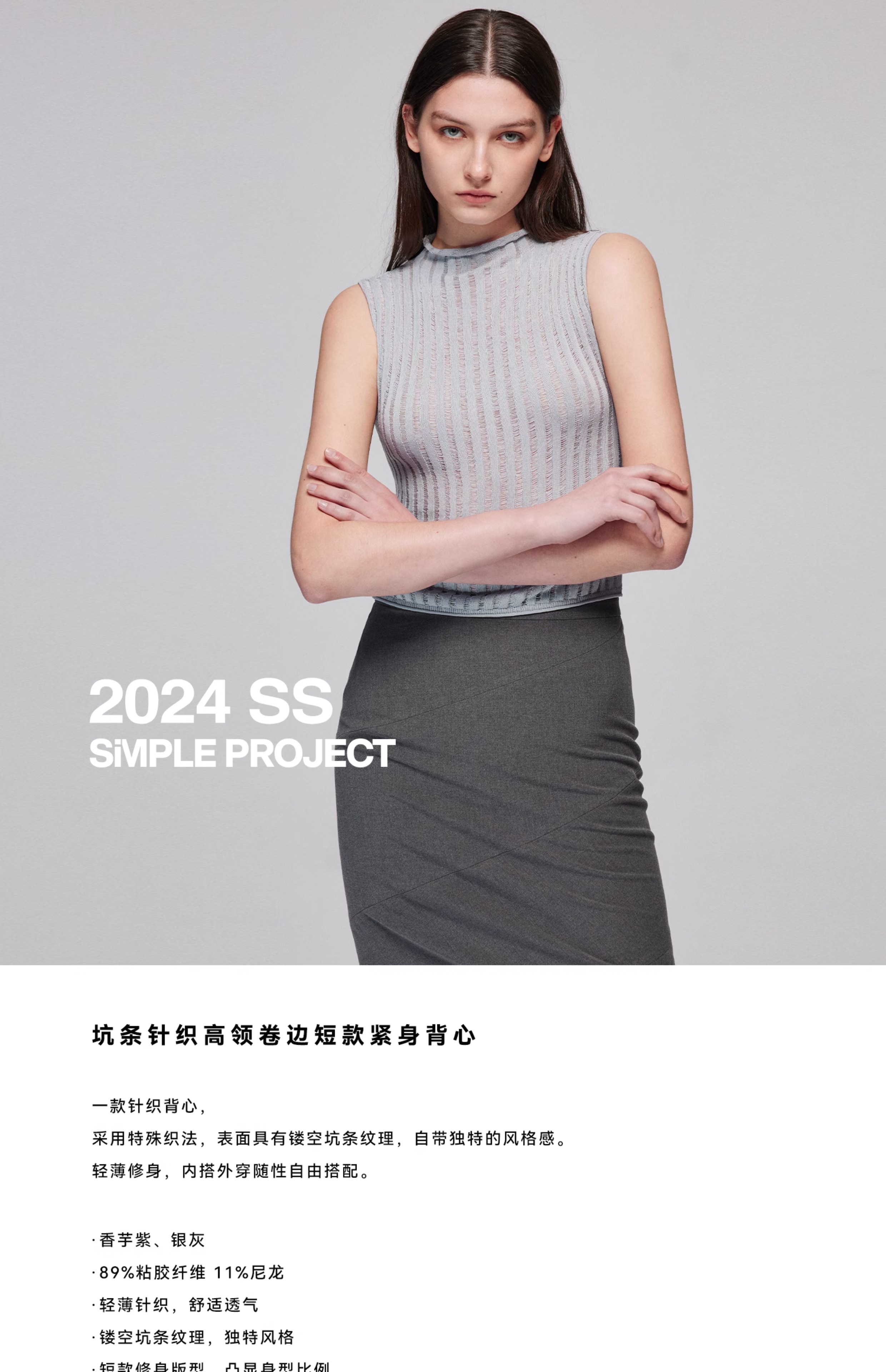Simple Project/M24106/尼龙混纺坑条针织高领卷边短款紧身背心