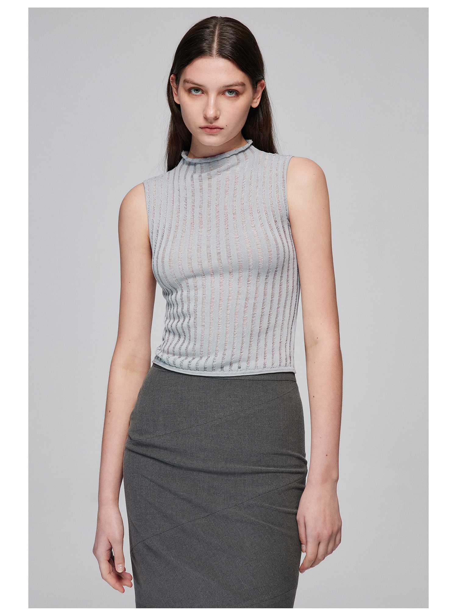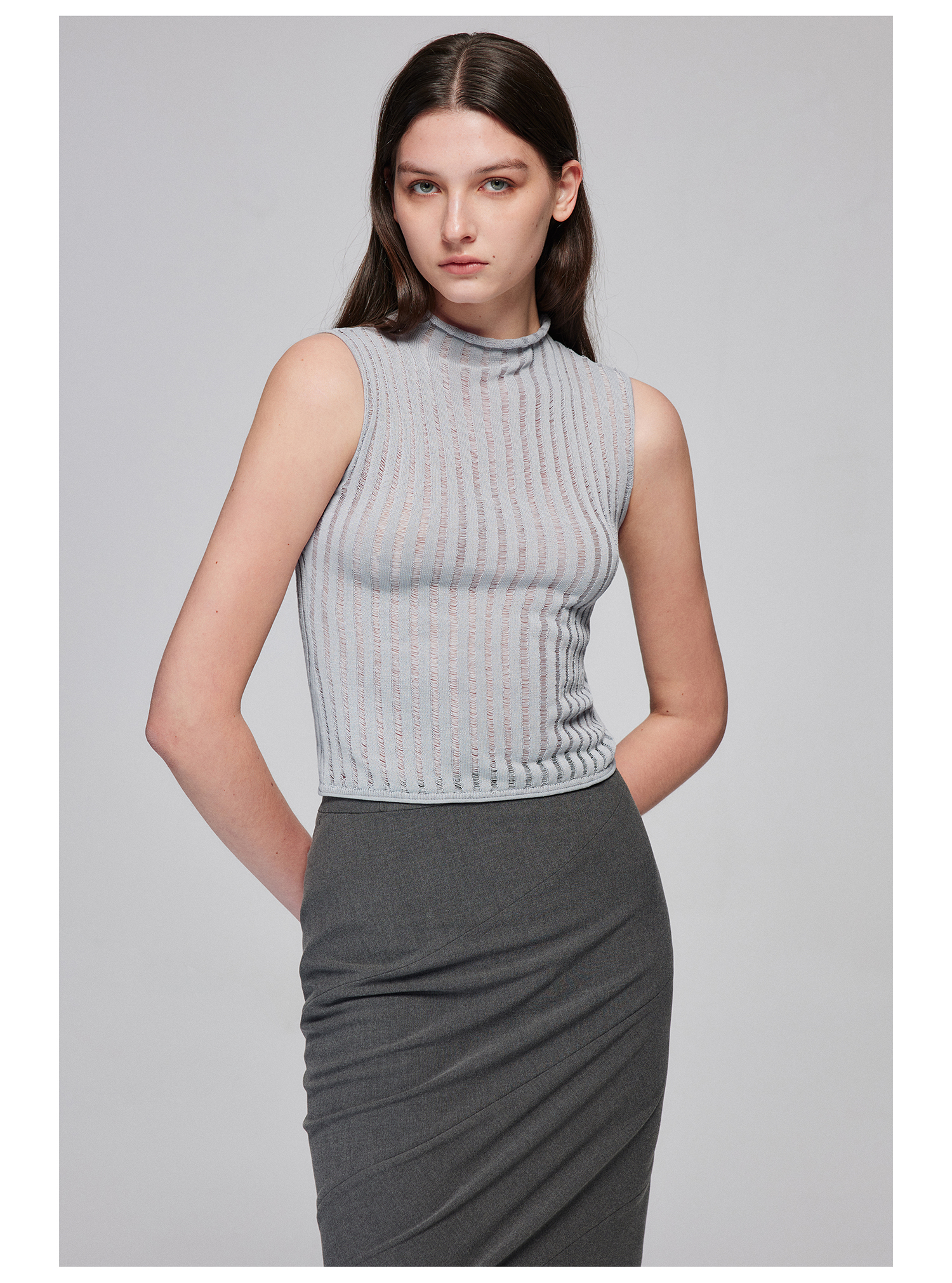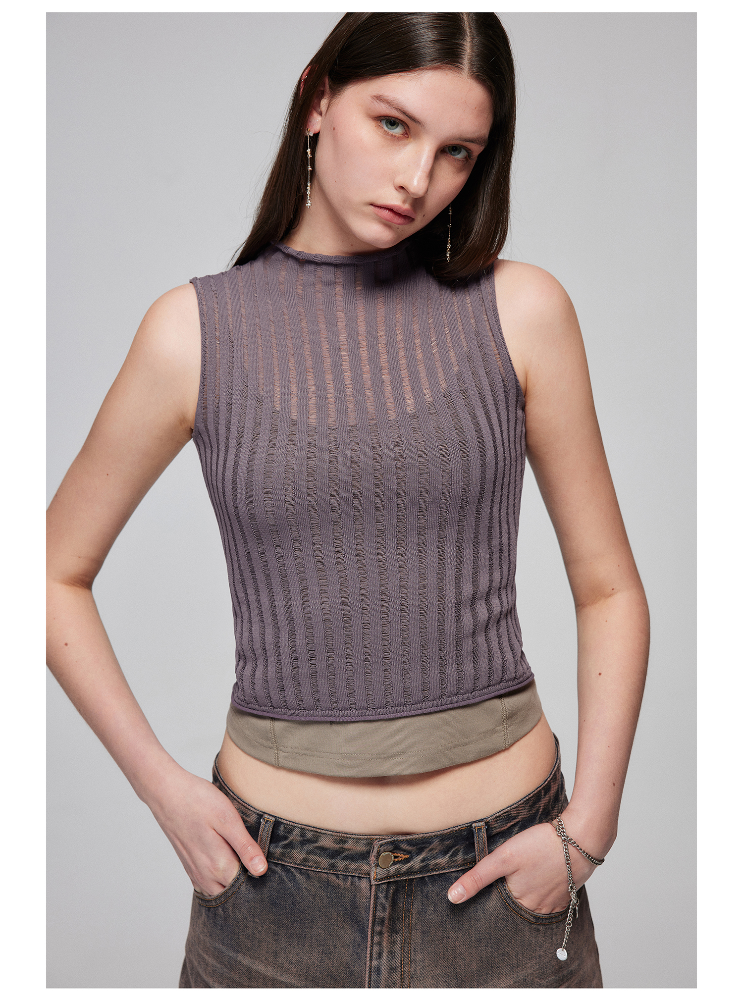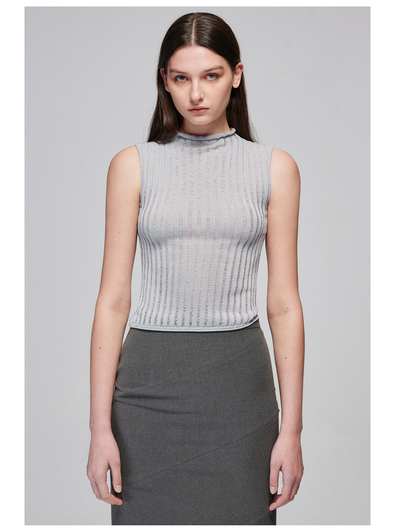 Simple Project/M24106/尼龙混纺坑条针织高领卷边短款紧身背心