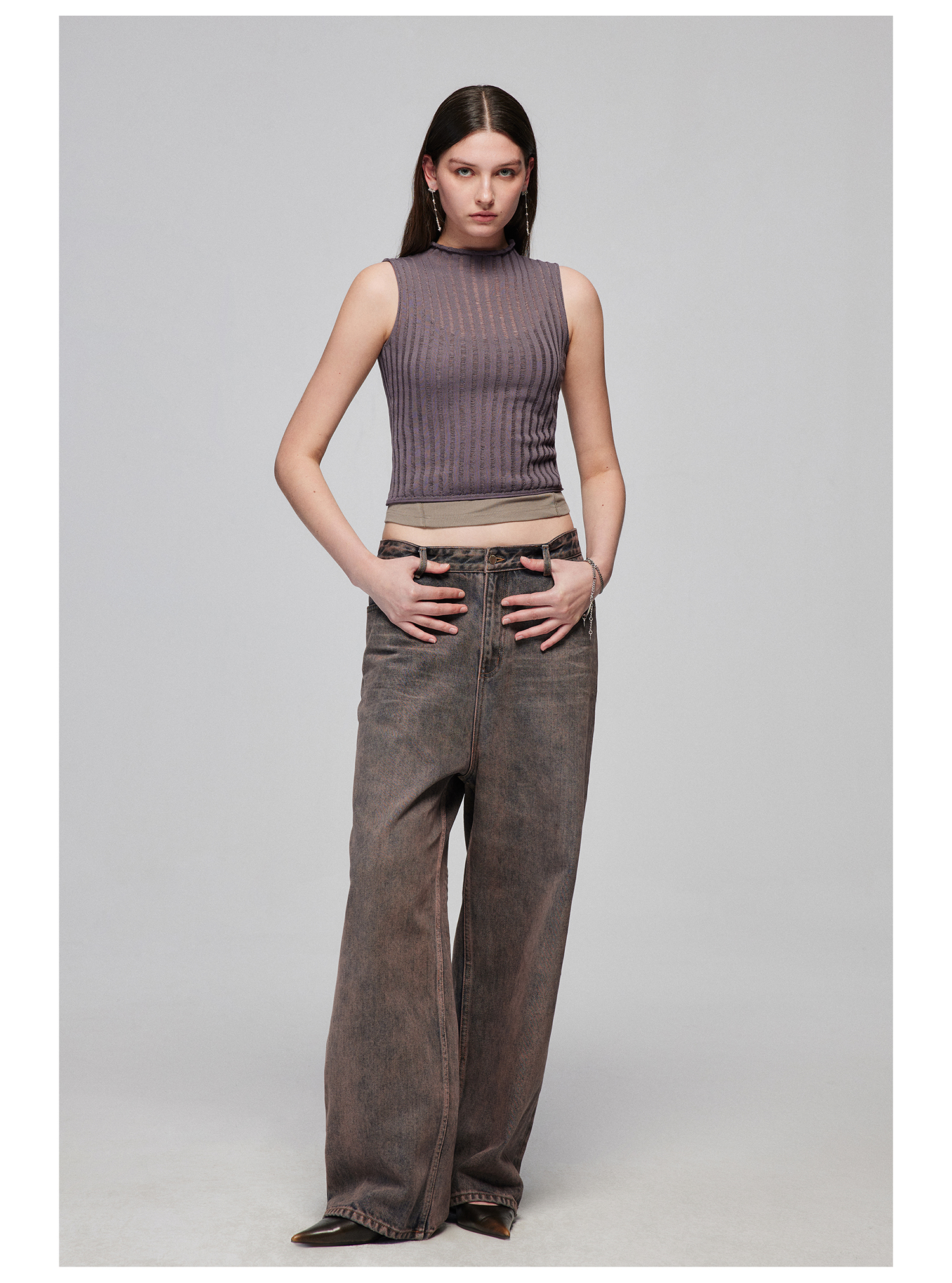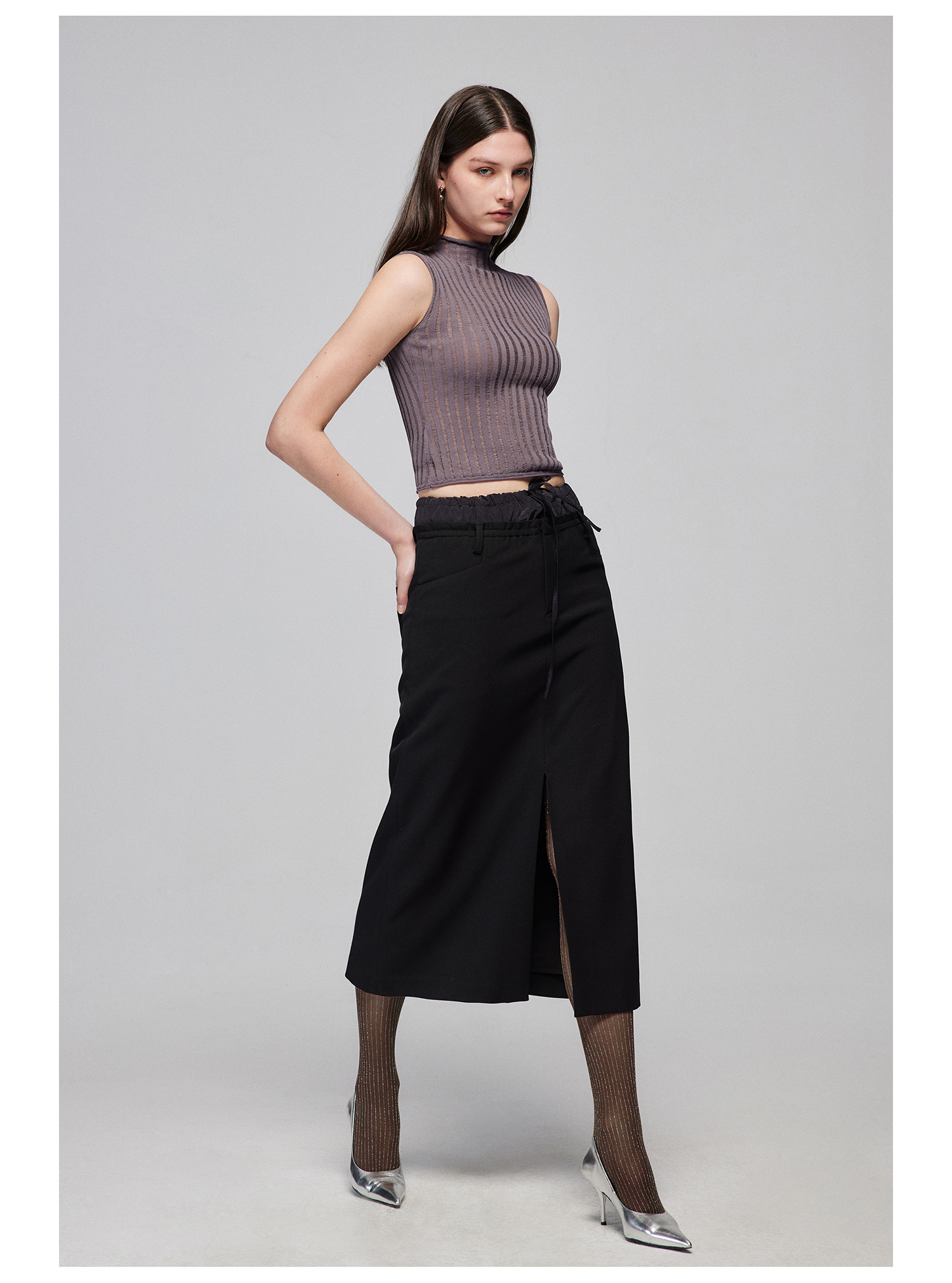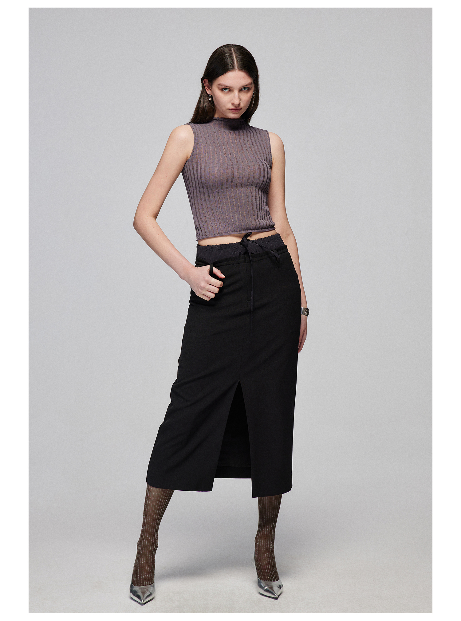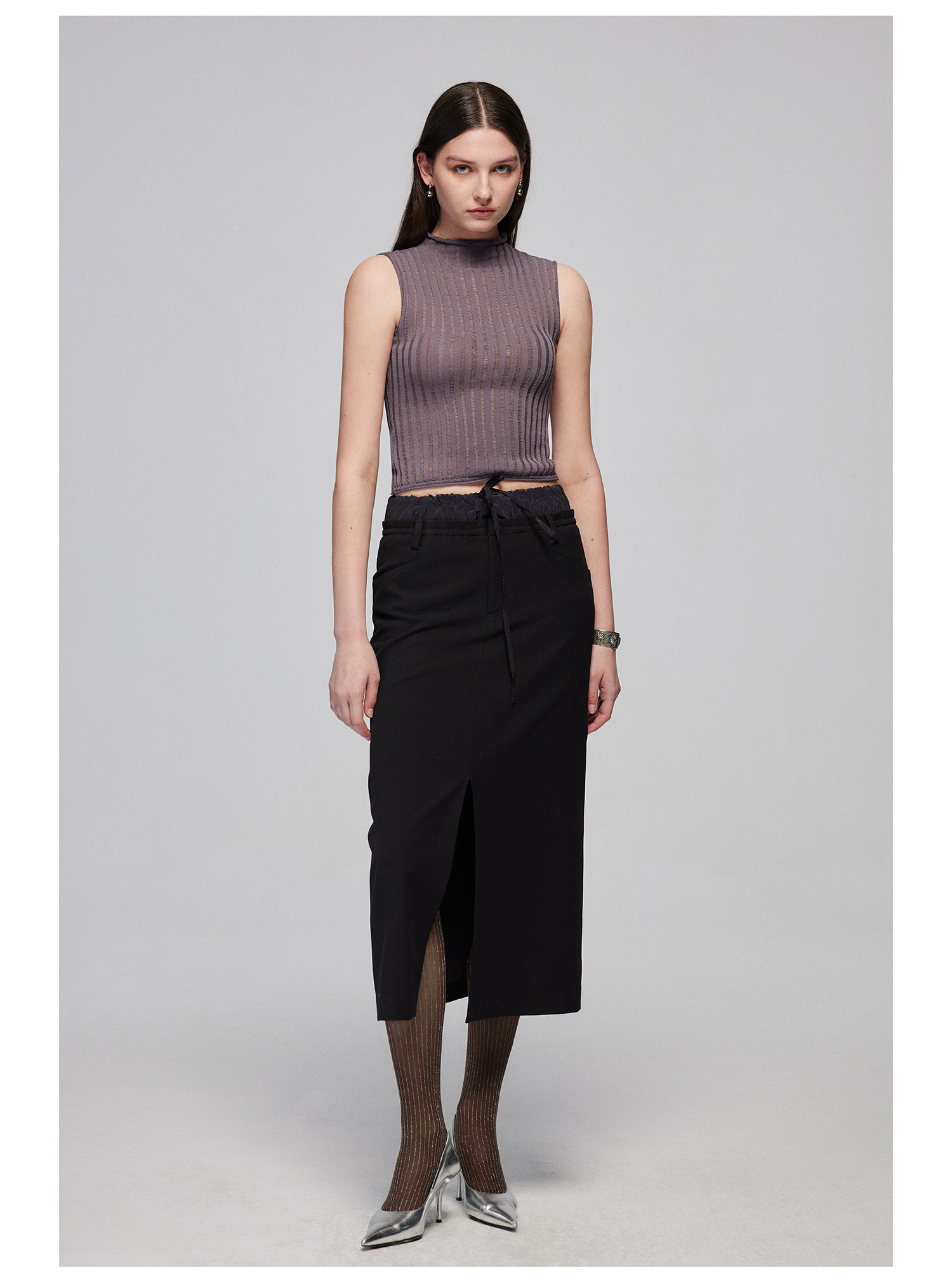 Simple Project/M24106/尼龙混纺坑条针织高领卷边短款紧身背心