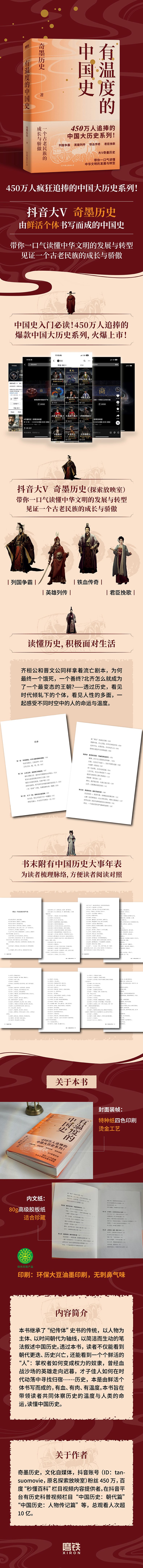 450万粉丝追更的“奇墨历史”,出书了!本书继承了“纪传体”史书的传统,以人物为主体、以时间朝代为轴线,以简洁而生动的笔法叙述中国历史。透过本书,读者不仅能看到朝代更迭、历史兴亡,还能看到一个个鲜活的“人”:看到掌权者如何变成权力的奴隶,看到曾经血战沙场的英雄走向迟暮,看到才子佳人如何在时代动荡中寻找归宿……历史,本是由鲜活个体书写而成的,有血、有肉、有温度。本书旨在带领读者共同体察历史的温度与人类的命运,读懂中国历史。