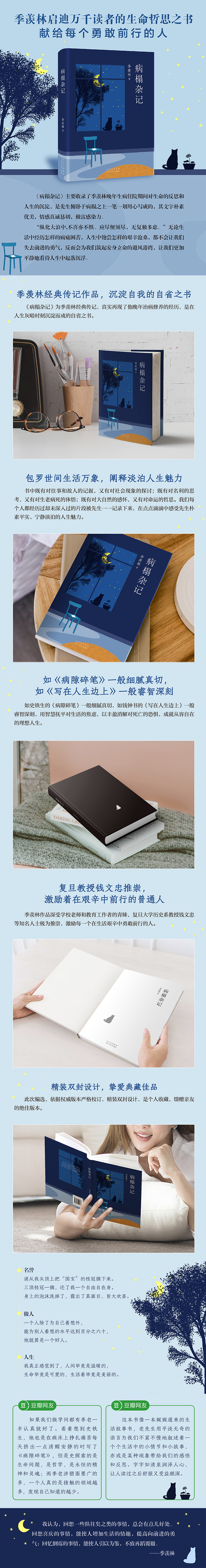 人生中,回想一些俱往矣之类的事情,总会有点儿好处。回想喜庆的事情,能使人增加生活的情趣,提高向前进的勇气;回忆倒霉的事情,能使人引以为鉴,不致再蹈覆辙。《病榻杂记》主要收录了季羡林晚年生病住院期间对生命的反思和人生的沉淀。书中既有对往事和故人的记叙,又有对社会现象的探讨;既有对名利的思考,又有对生老病死的体悟;既有对大自然的感怀,又有对命运的哲思。全书24万字,是先生俯卧于病榻之上一笔一划用心写成的,其文字朴素优美,情感真诚恳切,极富感染力。“纵化大浪中,不喜亦不惧。应尽便须尽,无复独多虑。”无论生活中经历怎样的病痛困苦,人生中饱尝怎样的艰辛沧桑,都不会让我们失去前行的勇气,反而会为我们筑起安身立命的避风港湾,让我们更加平静地看待人生中起落沉浮。