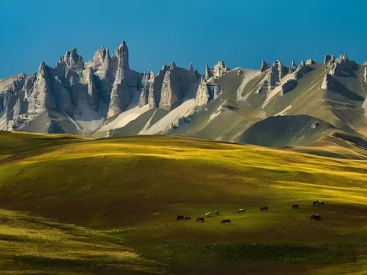天山石林:在尤尔都斯盆地的西北,巴音布鲁克草原的尽头,天山石林静静地矗立。它由风蚀与水蚀共同塑造,布满陡峭的岩柱与深谷。在亿万年的剥蚀中,侏罗纪砂岩层形成高度超过二十米的石林。