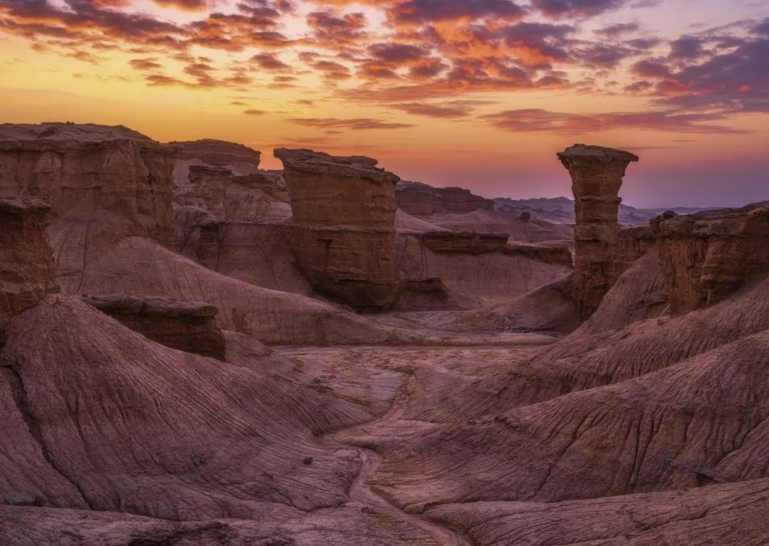 克玫尔魔鬼城:梦幻般的魔鬼城地处少雨多风的干旱区,经千万年风蚀形成。岩层被切割成城堡、巨兽、佛塔等奇特造型,尤其在夕阳下呈现金色剪影,科幻感十足