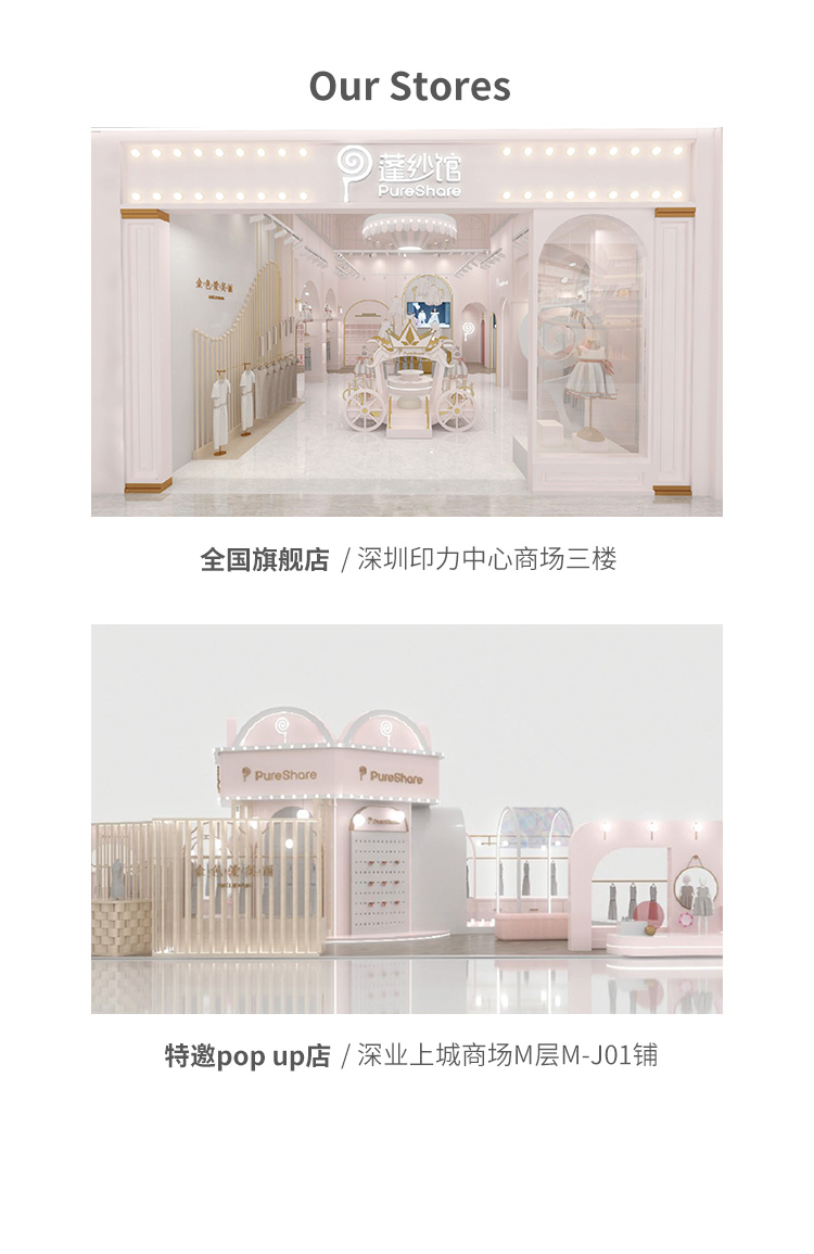 - PureShare蓬纱馆,2018年创立的儿童服装品牌,专注于儿童轻奢生活类小礼服,主张“让孩子做最独特的自己”的品牌理念,为孩子们提供时尚简洁、优雅而又不失童真的生活类礼服。