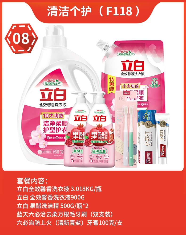 福卡套餐7 清洁个护 立白全效馨香洗衣液 果醋洗洁精 六必治防上火(清新青盐)牙膏 组合 员工福利 家庭清洁