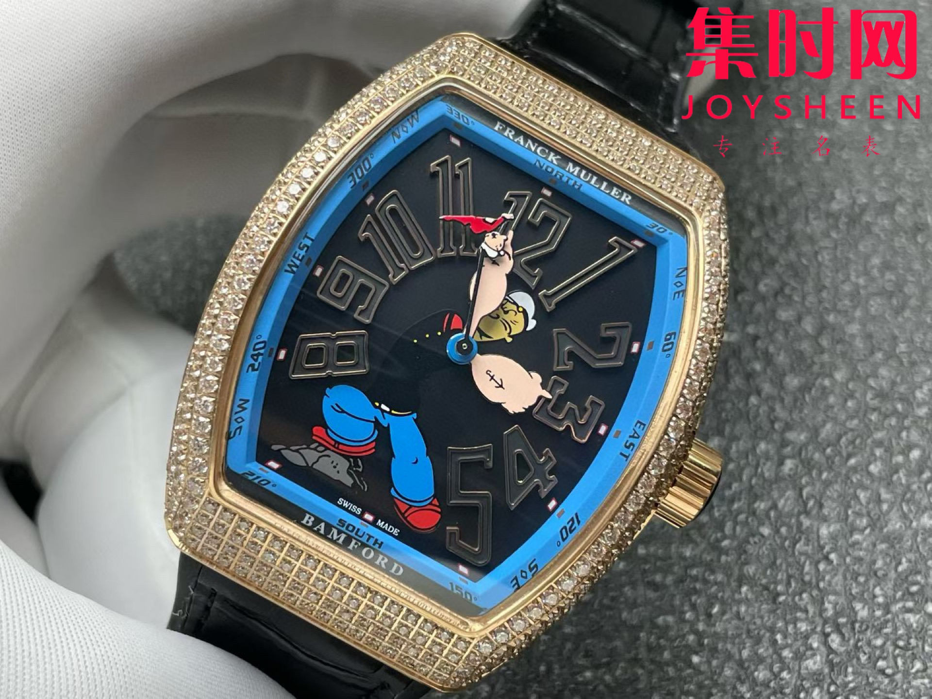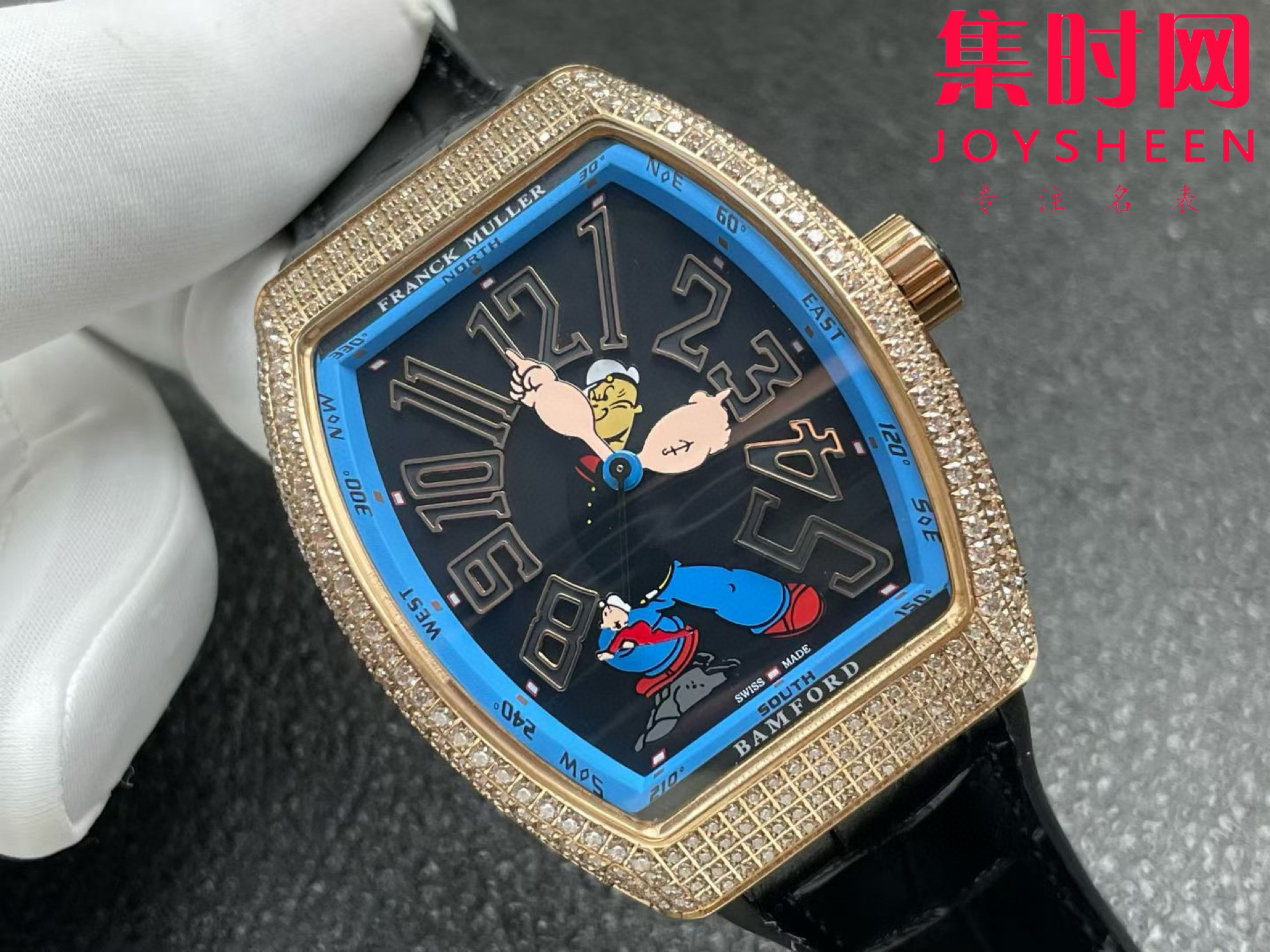 ABF法兰克穆勒 法穆兰 新款Vanguard系列 V45游艇系列"大力水手"男士腕表 以大力水手波派的强壮双臂充当时分指针,以波派和奥利弗的儿子贝比作为秒针,在表盘上"爬动",简洁和创新的美感,超凡脱俗。