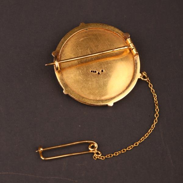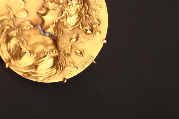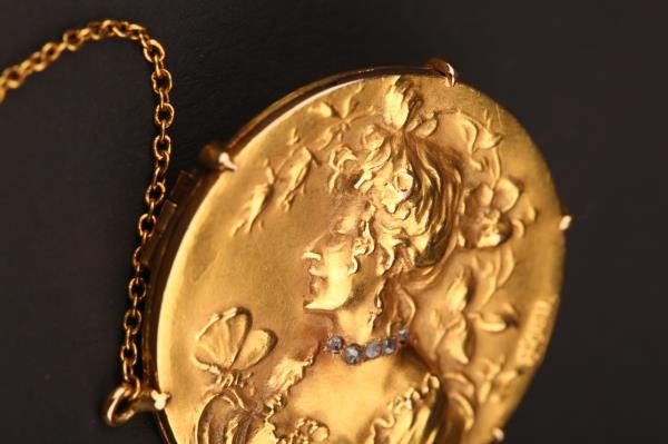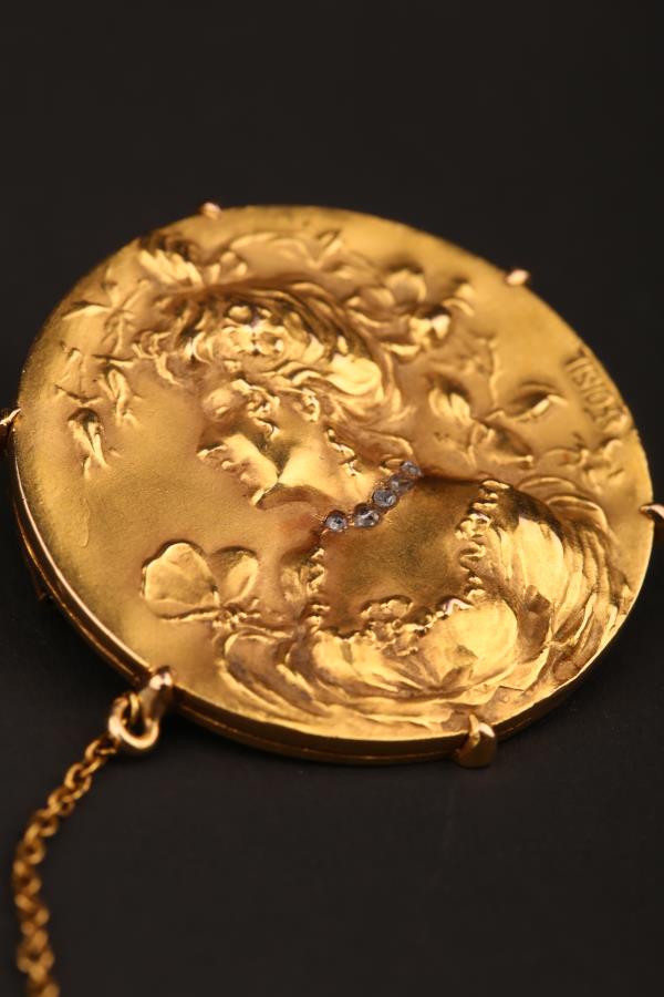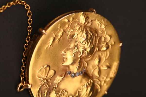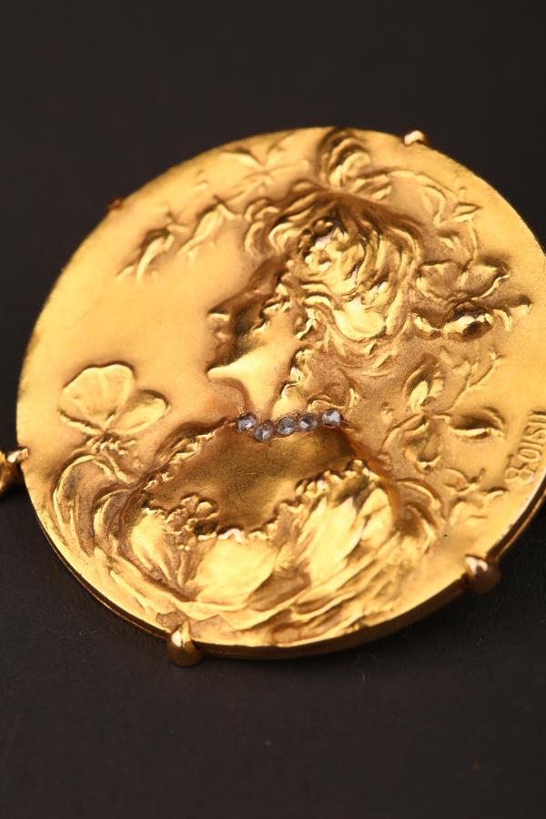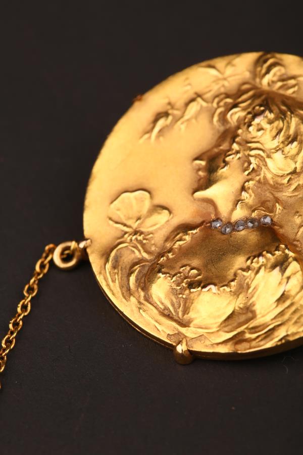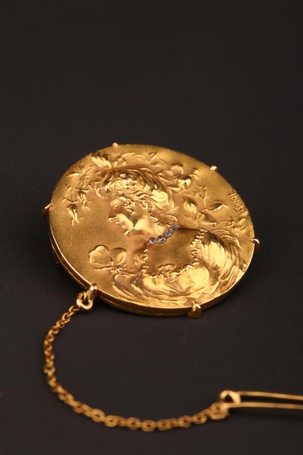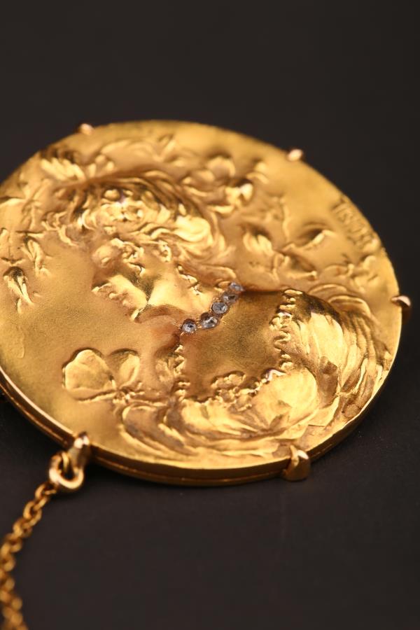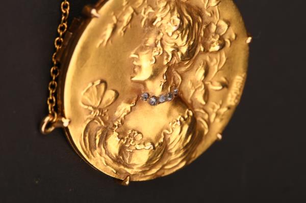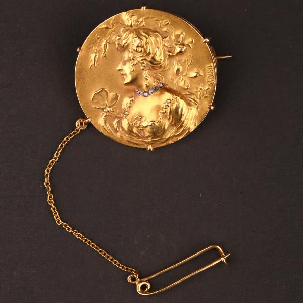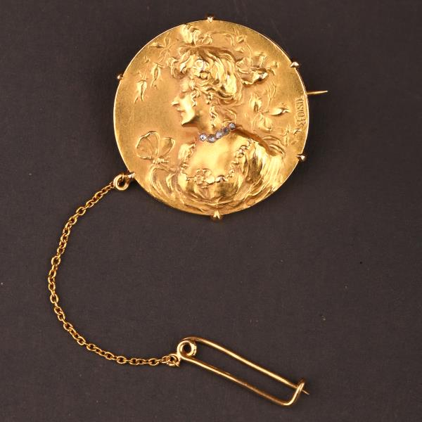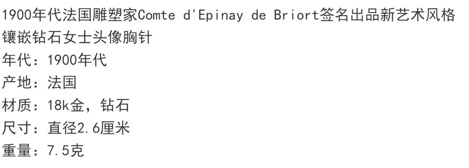 独角鹿西洋古董法国新艺术风格18K金镶嵌钻石雕塑女士头像胸针