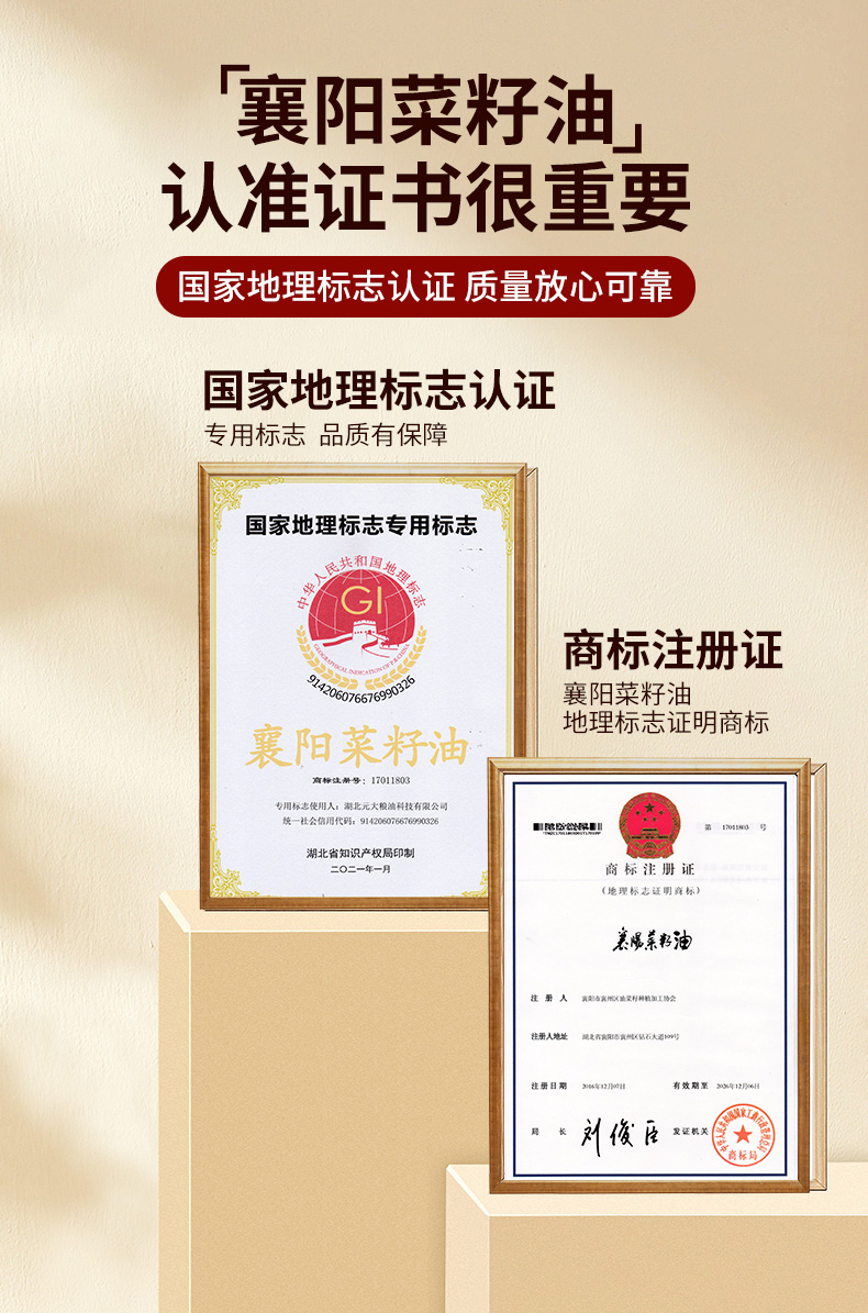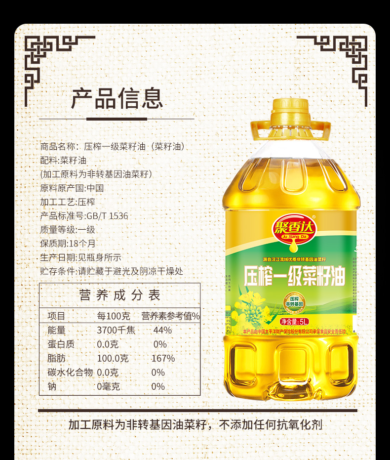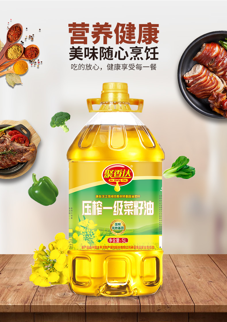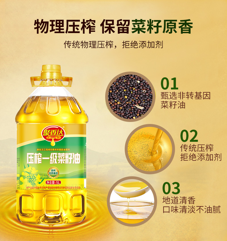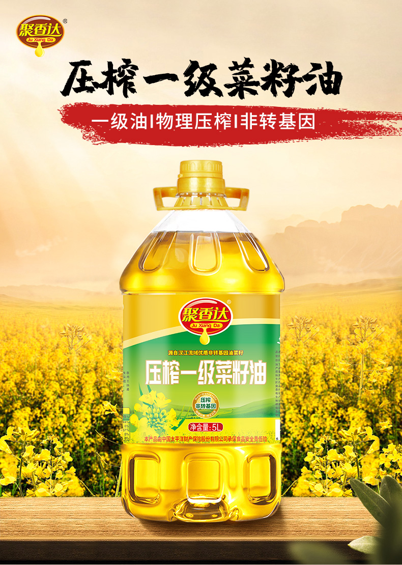 【严选】荆楚好粮油 非转基因 湖北襄阳元大 聚香达压榨一级菜籽油5L/桶(厂家直发)