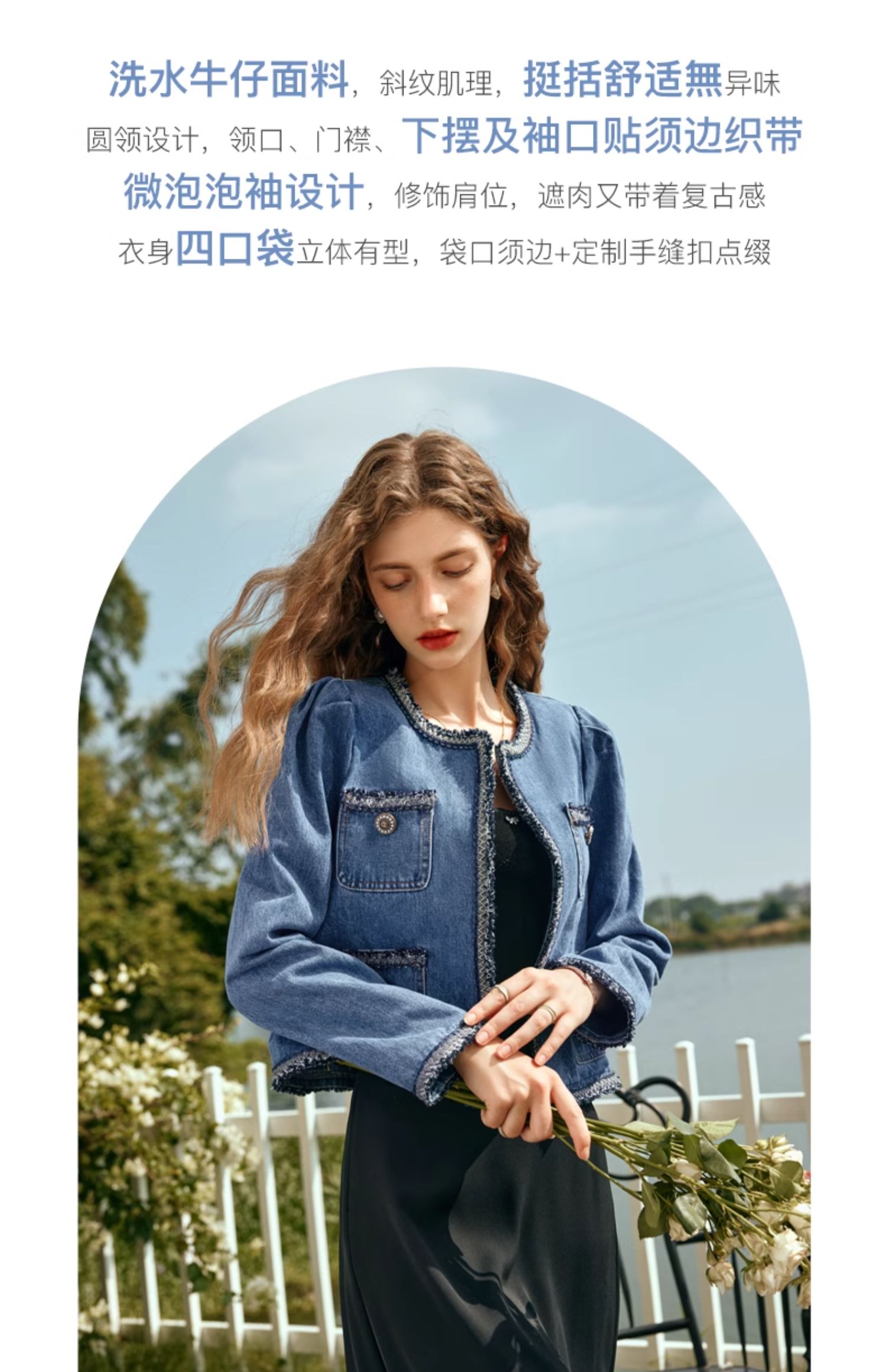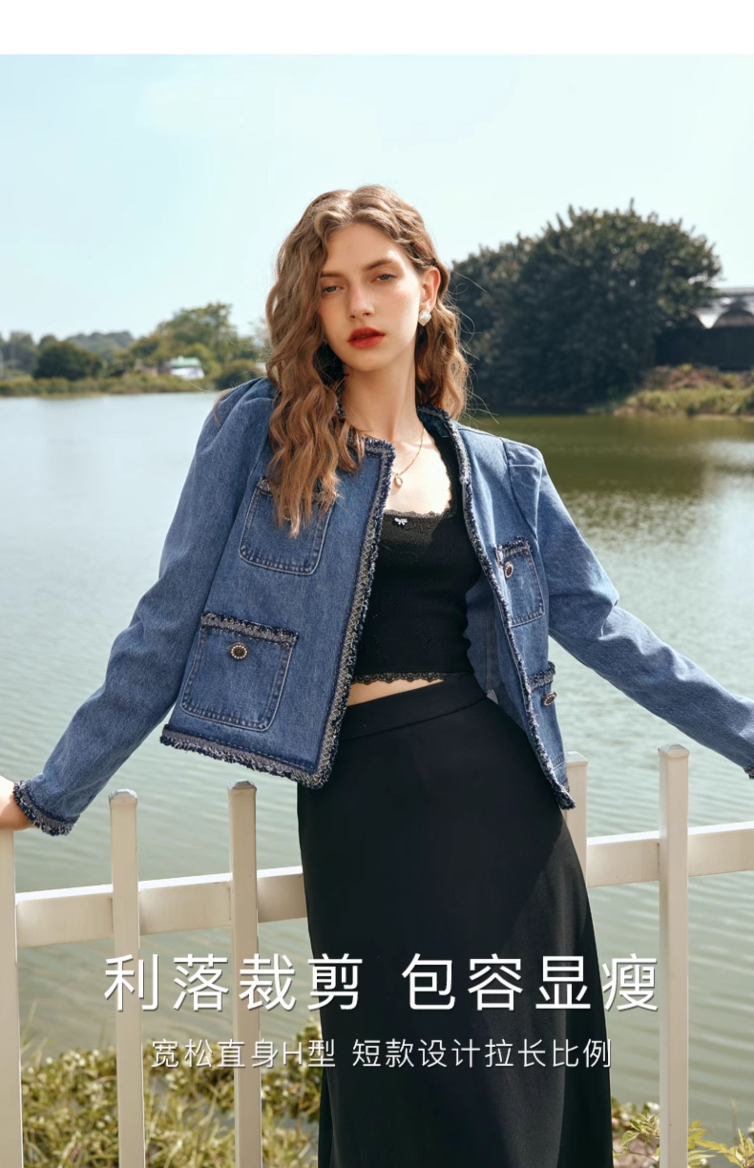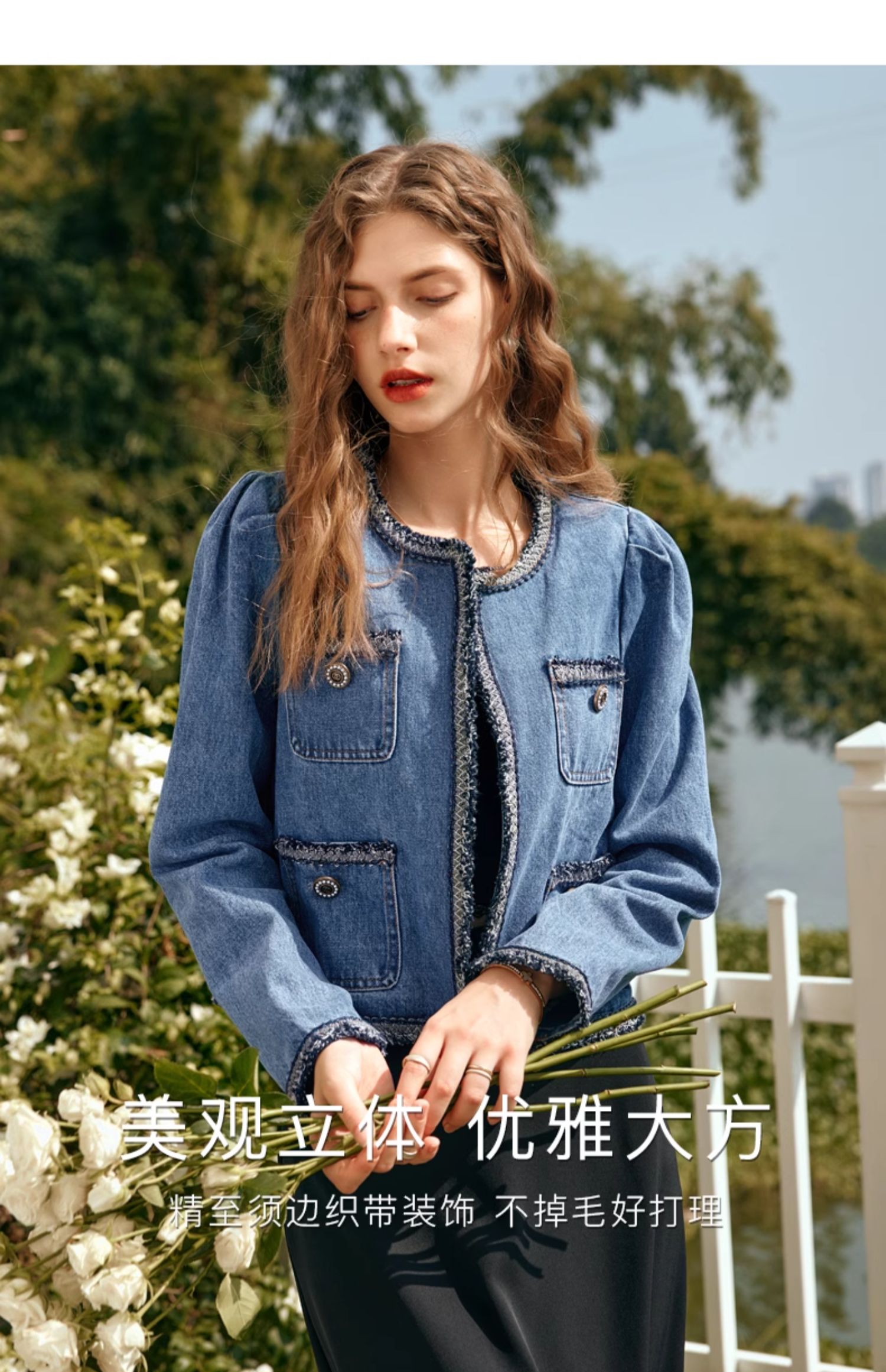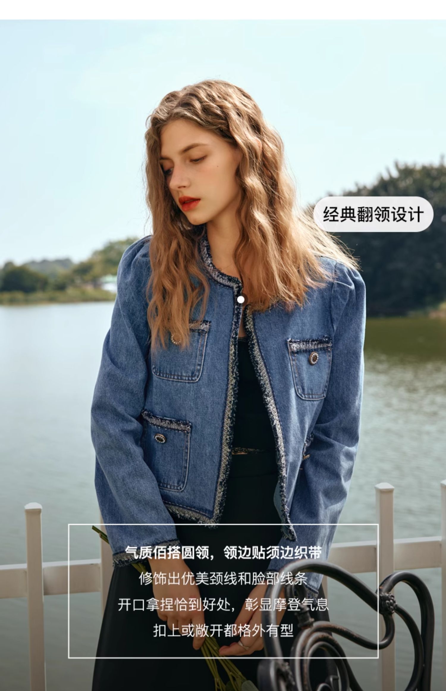 OLrain欧芮儿法式小香风牛仔外套女早春2024年新款复古圆领上衣