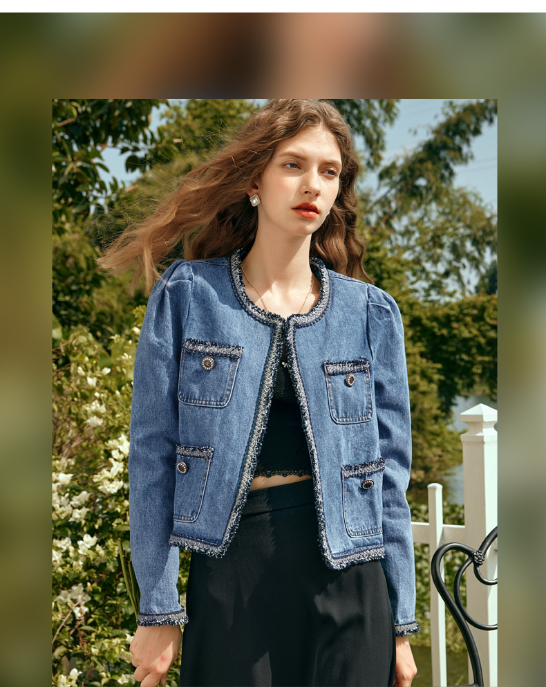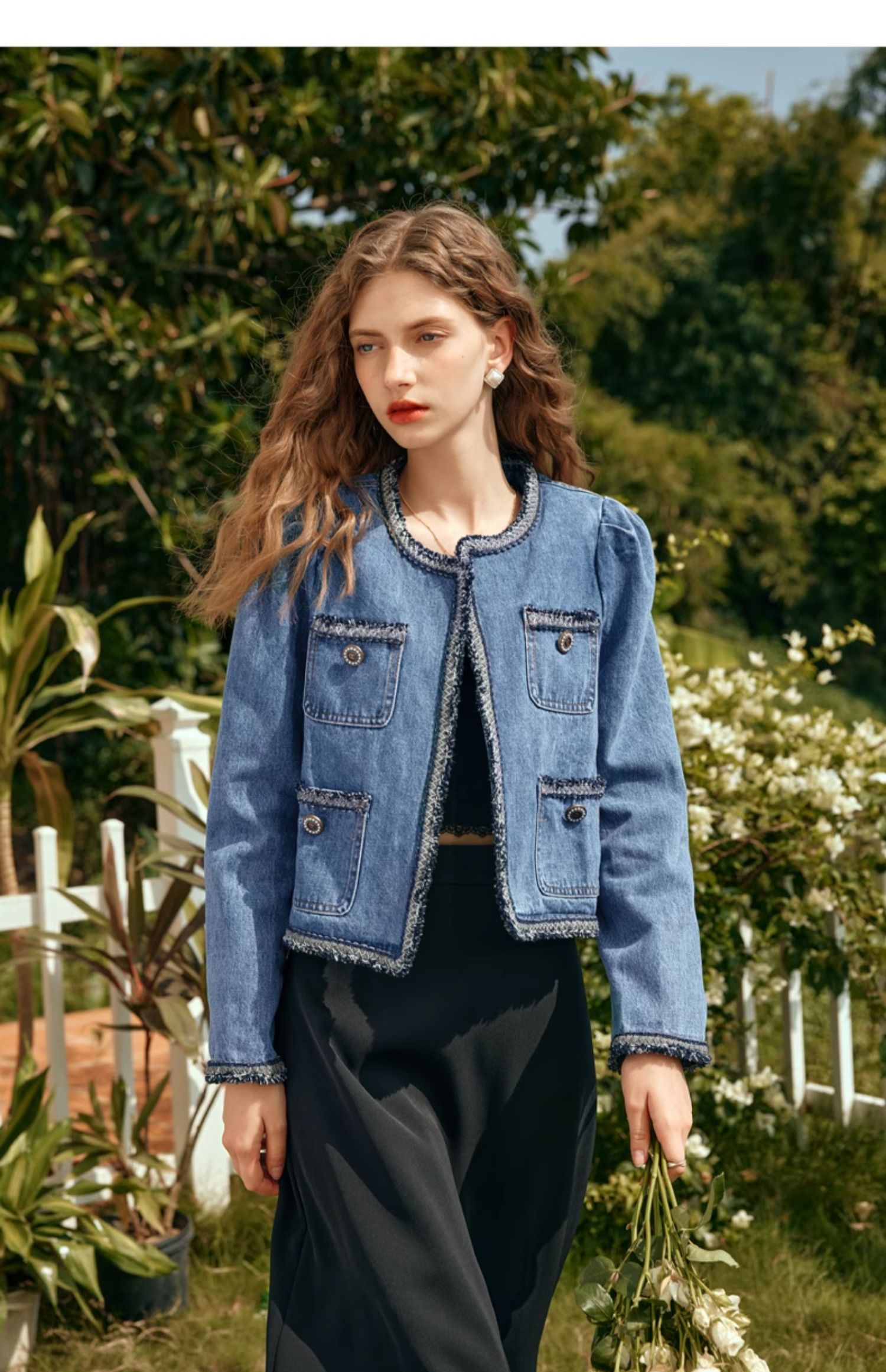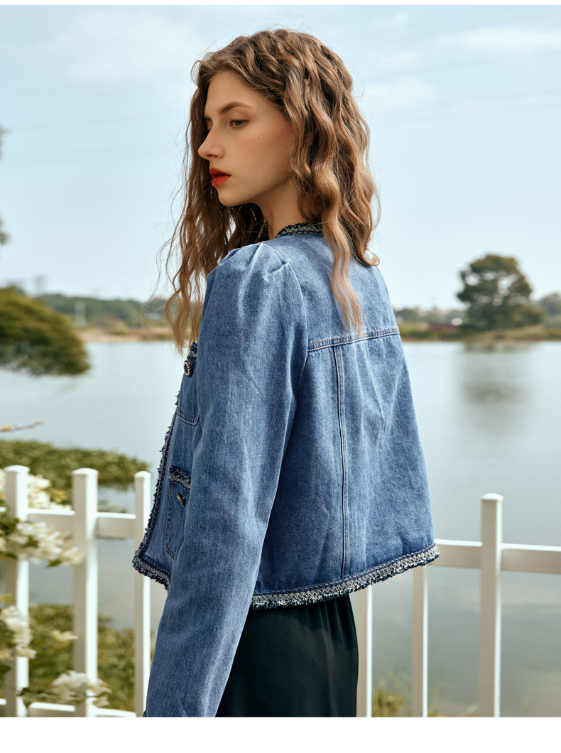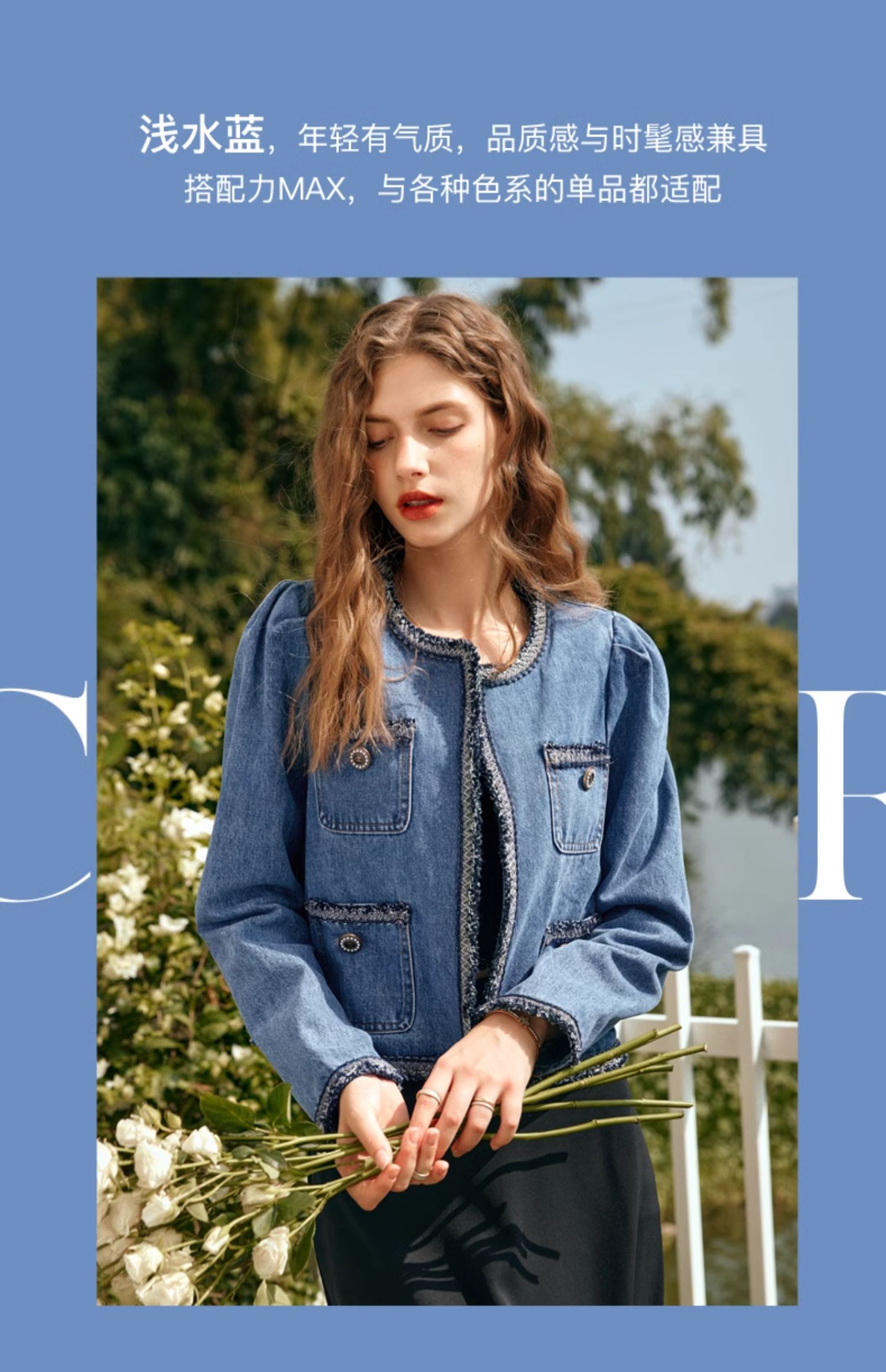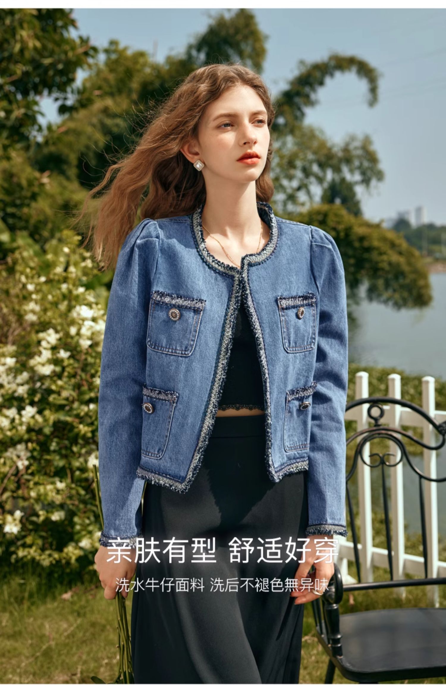 OLrain欧芮儿法式小香风牛仔外套女早春2024年新款复古圆领上衣