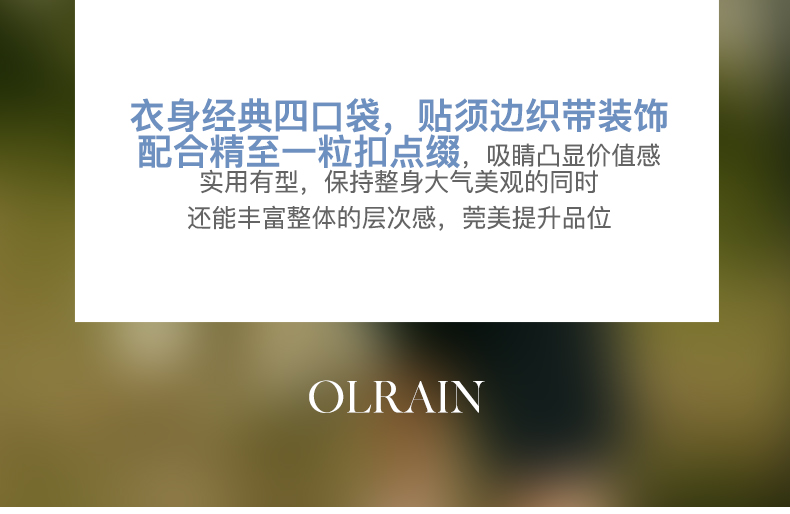 - “精致”是欧芮儿olrain品牌文化的核心,欧芮儿认为,精致的女人,不但要外在动人,更要内在迷人,内外兼修,有魅力、有气质、有内涵,自信而不自傲,优雅而不矫揉,自有万种风情而不轻浮,更不故作矜持。