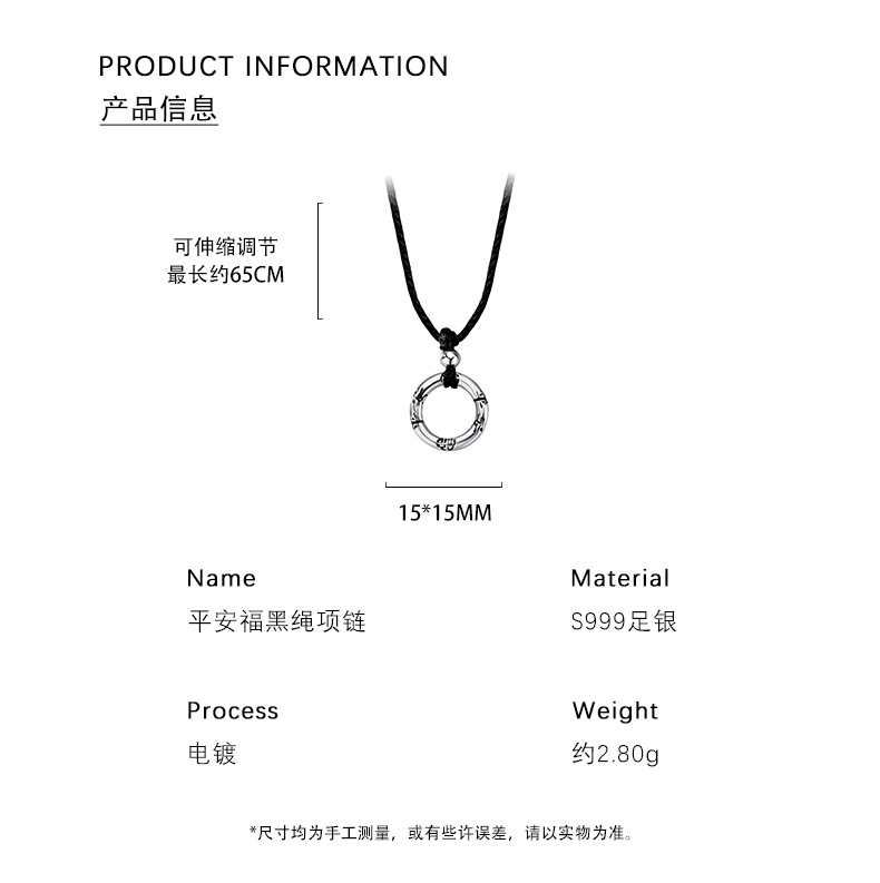 【平安】S999银足银编织黑绳平安福圆环平安扣项链【YXS-A3036】