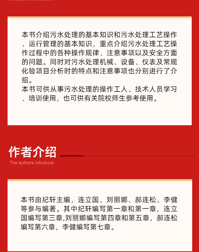 本书介绍污水处理的基本知识和污水处理工艺操作、运行管理的基本知识,重点介绍污水处理工艺操作过程中的各种操作规律、注意事项以及*方面的问题。同时对污水处理机械、设备、仪表及常规化验项目分析时的特点和注意事项也分别进行了介绍。