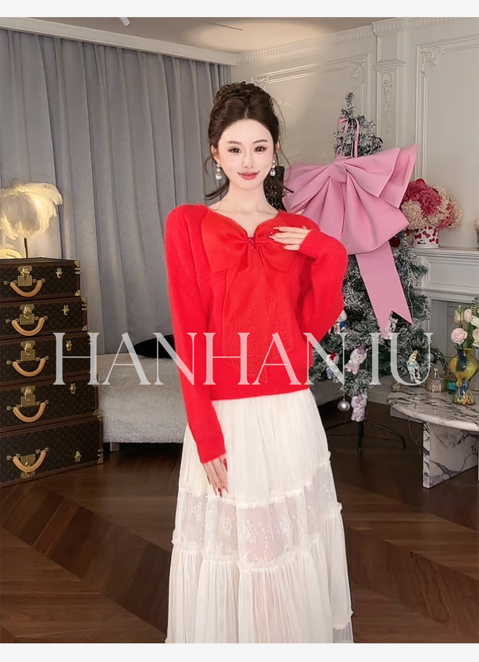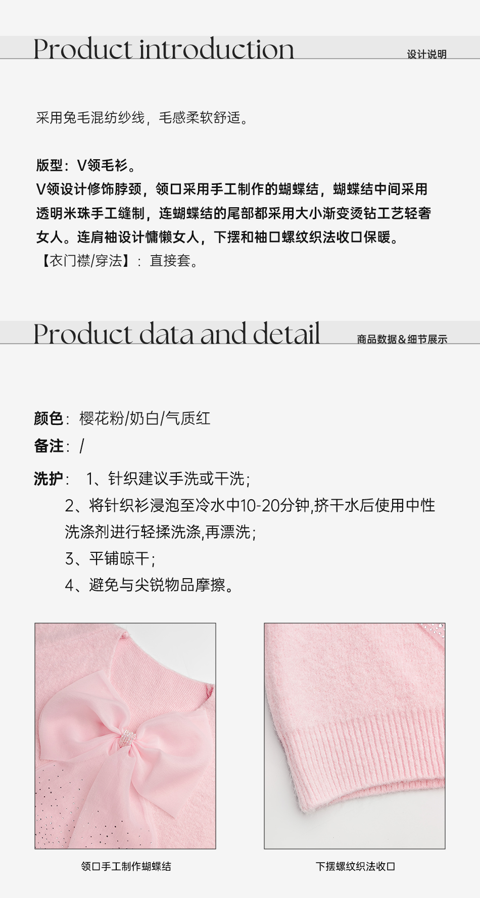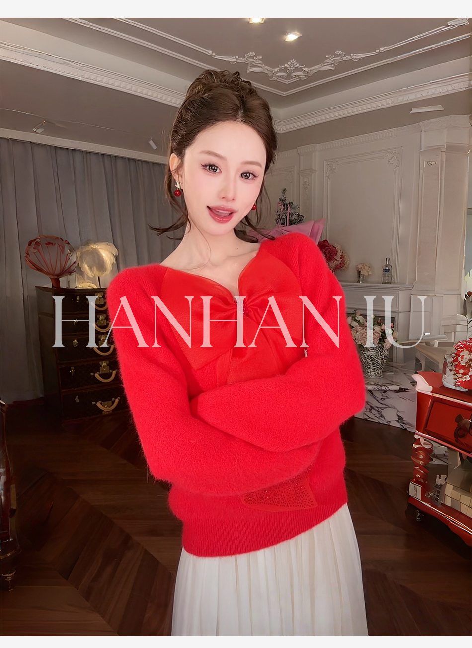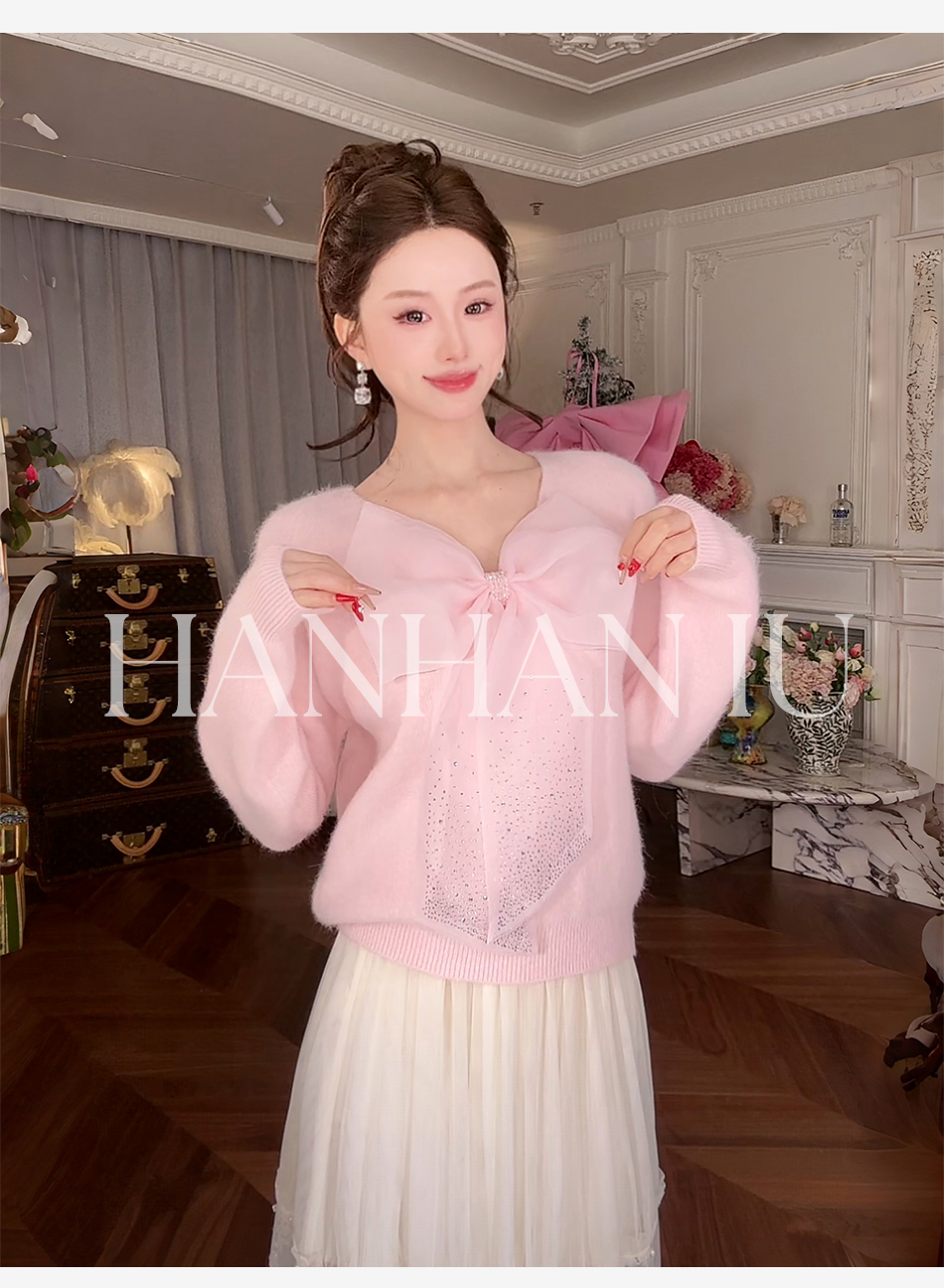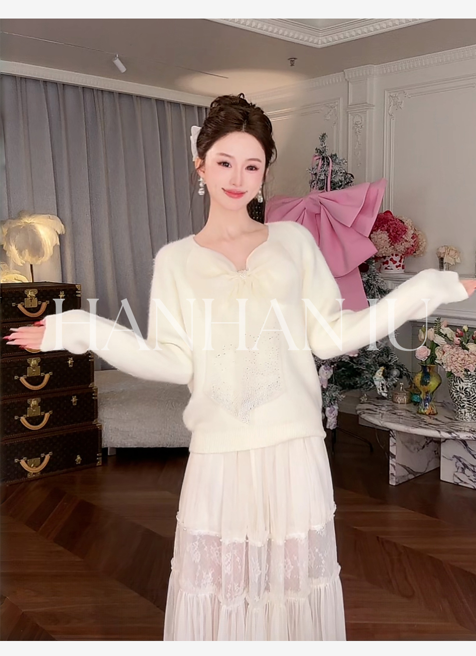 【孤品样衣,不退不换】【甜心记忆】高定兔毛混纺纱线手工亮钻蝴蝶结女士毛衫外套