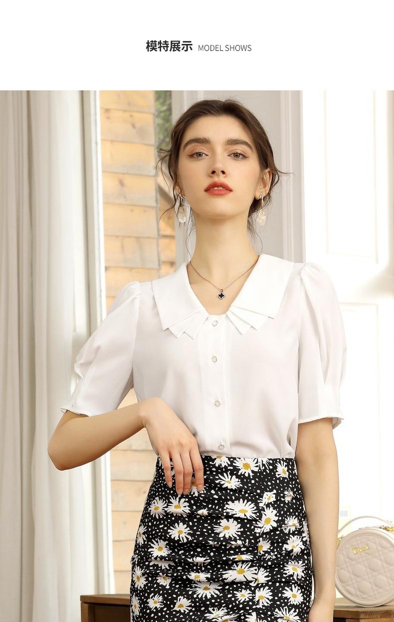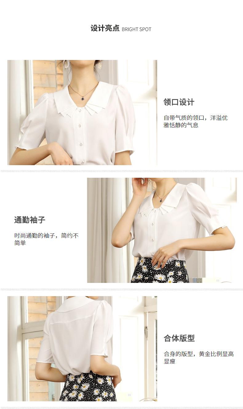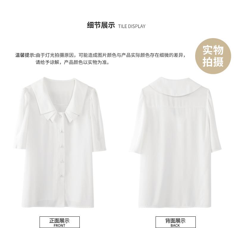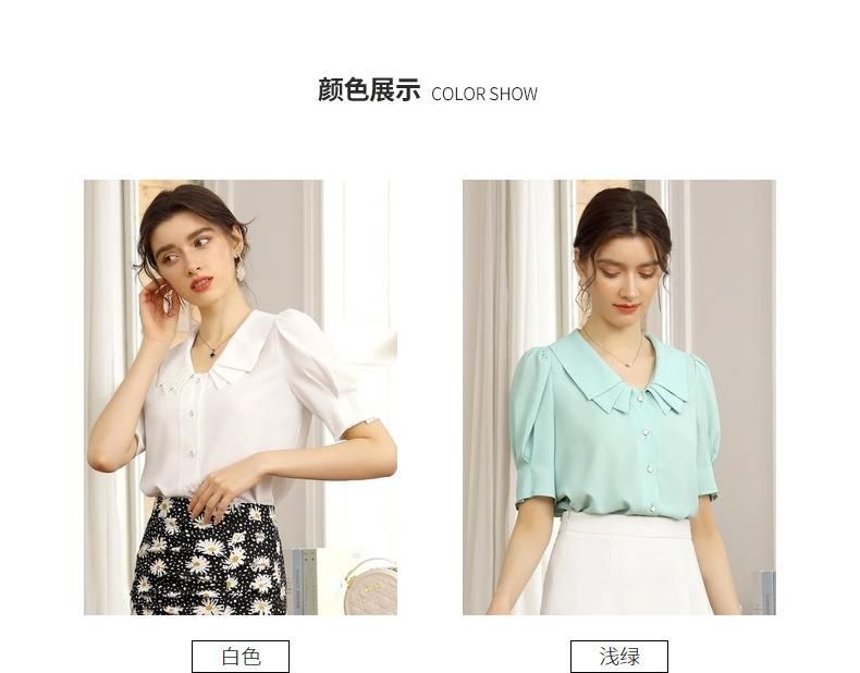 百姿 新款纯色直筒型泡泡袖雪纺衫娃娃领单排扣开衫短袖