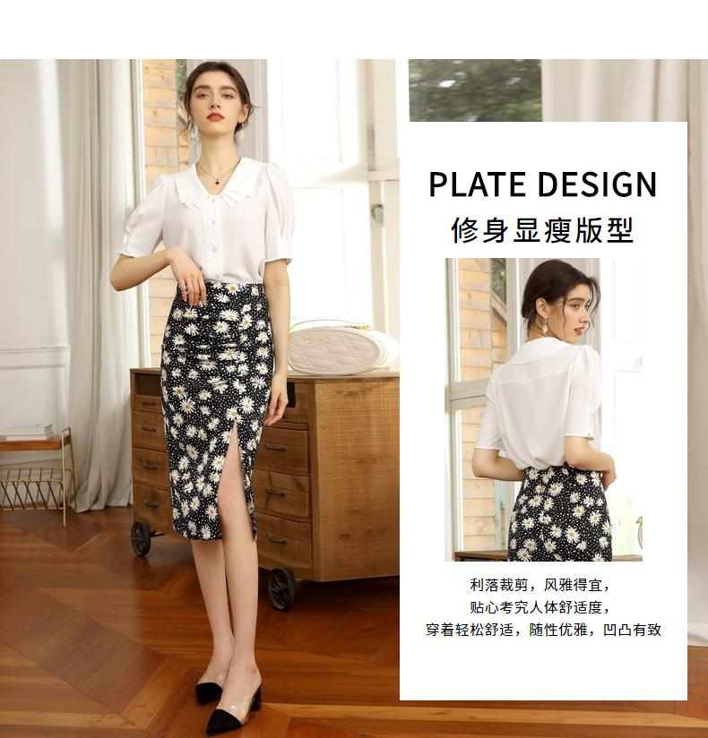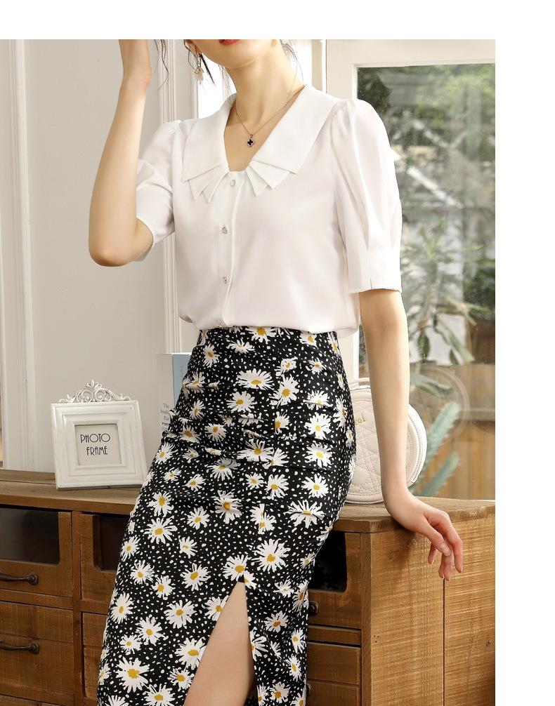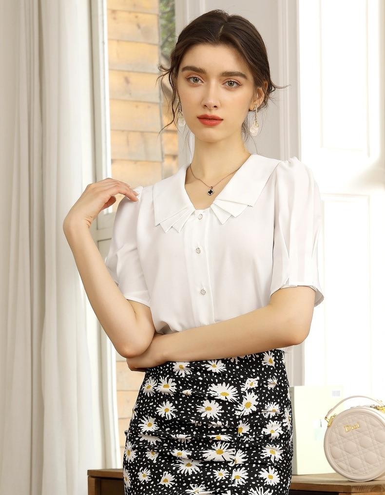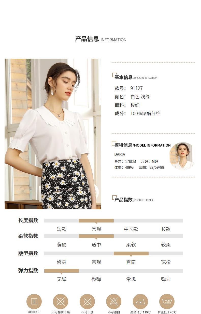 百姿 新款纯色直筒型泡泡袖雪纺衫娃娃领单排扣开衫短袖