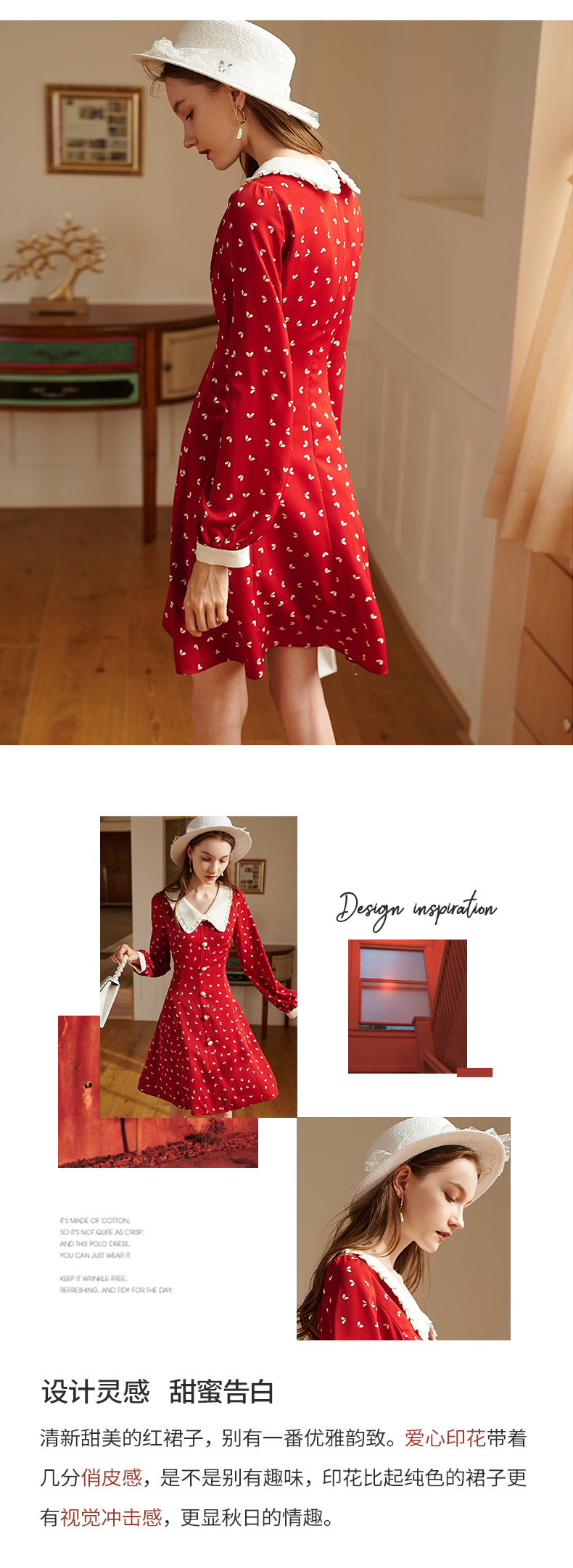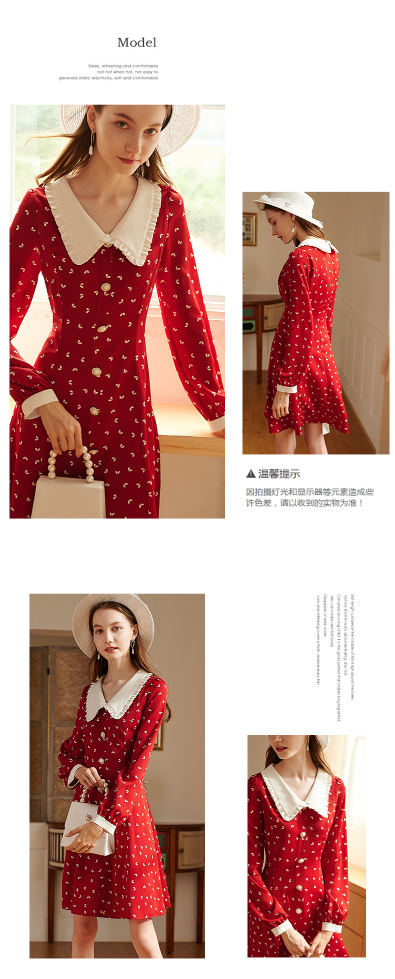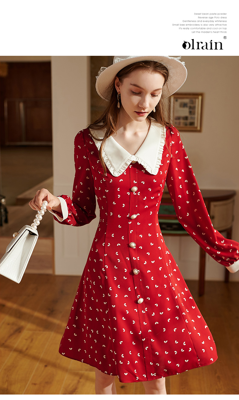 2019秋装新品长袖V领印花雪纺红色连衣裙气质收腰中长款衬衫裙