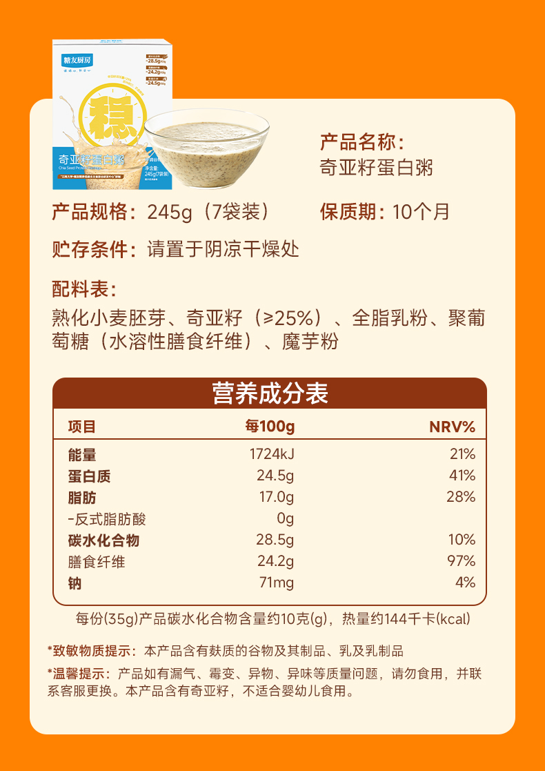 糖友厨房 奇亚籽蛋白粥 245g/245g*2