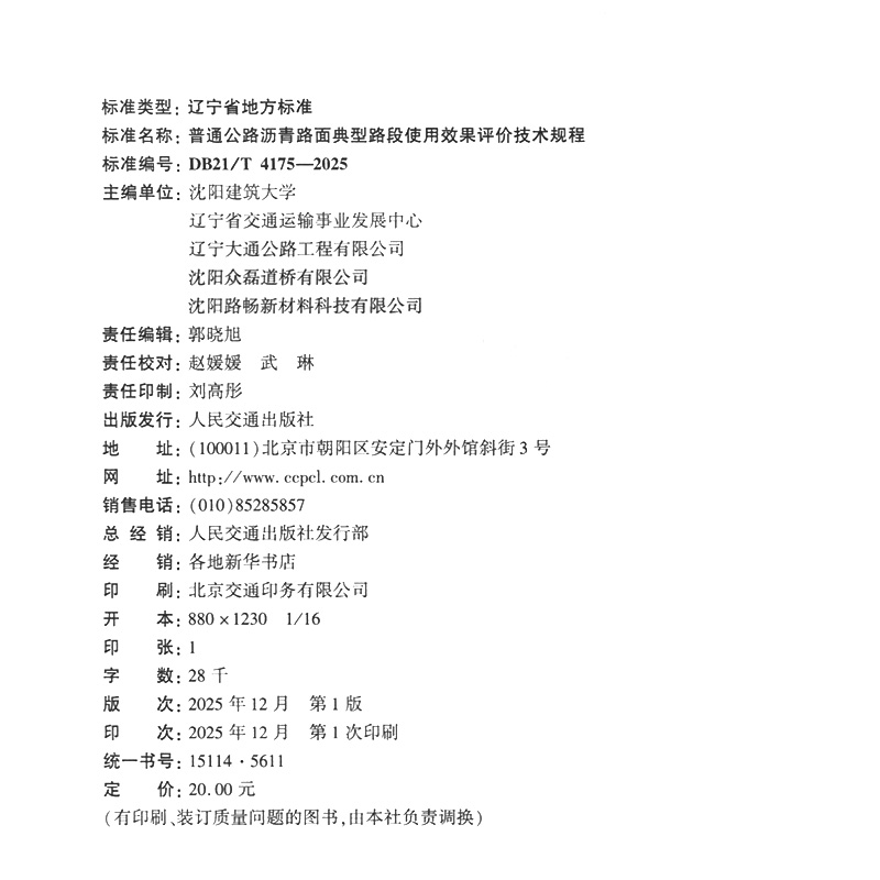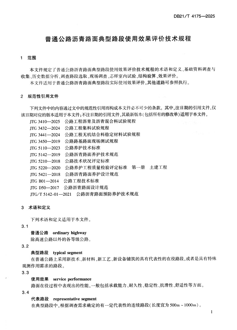 书名:普通公路沥青路面典型路段使用效果评价技术规程(DB21/T 4175—2025)
