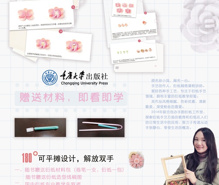 作者简介原名孙小凤,网名一心。手艺创作人,衍纸网络课程讲师。爱好各种手工艺,专注于衍纸手艺领域,拥有丰富的衍纸教学经验。其作品风格细腻,色彩优雅,清新唯美,深受粉丝的喜爱。2014年联合创办手韵衍纸工作室,探索衍纸手艺方面的教育和衍纸在人们的日常生活中的应用,致力于传递从动手到静心,享受生活的概念。