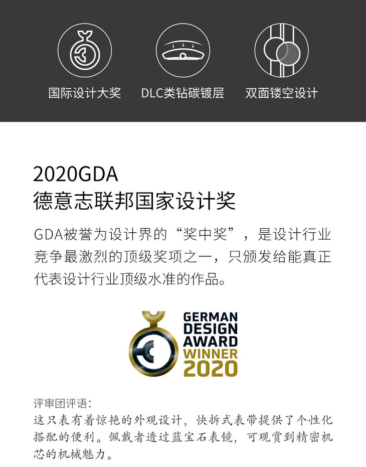 - 钟表界设计先锋,2021年荣获第19届瑞士日内瓦钟表大赏GPHG的中国品牌。秉持“设计成就非凡”理念,坚守原创,突破传统。