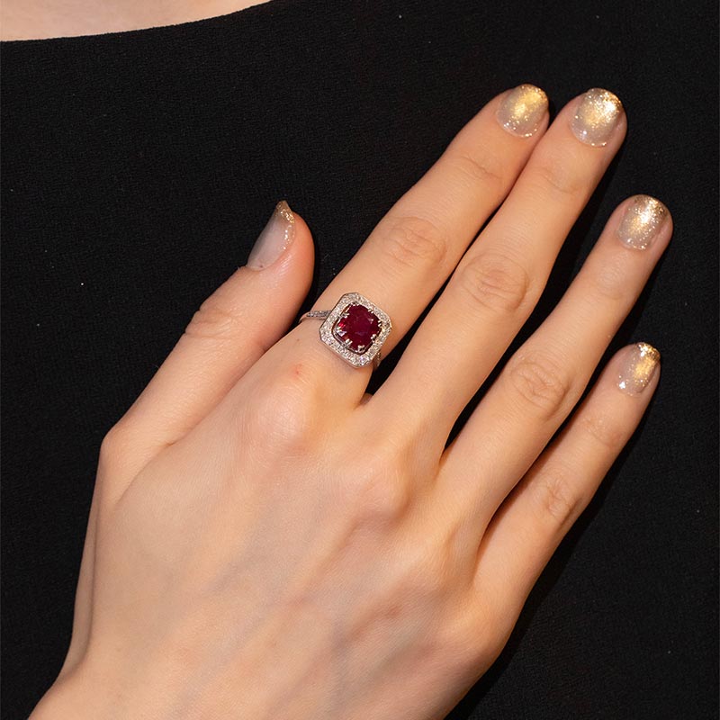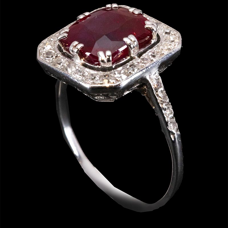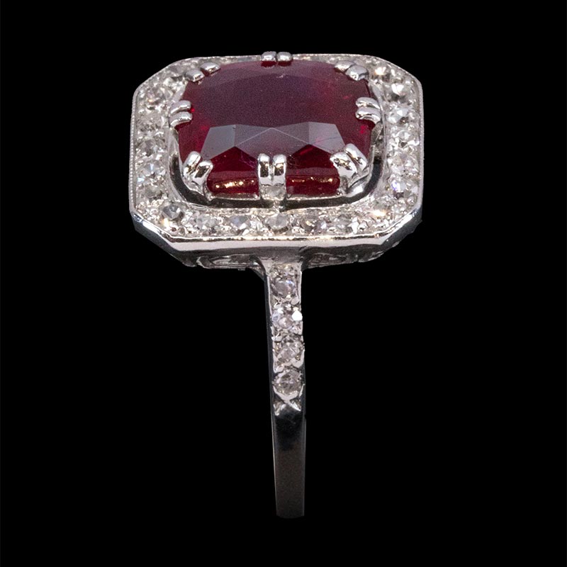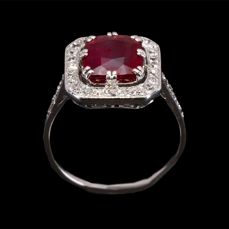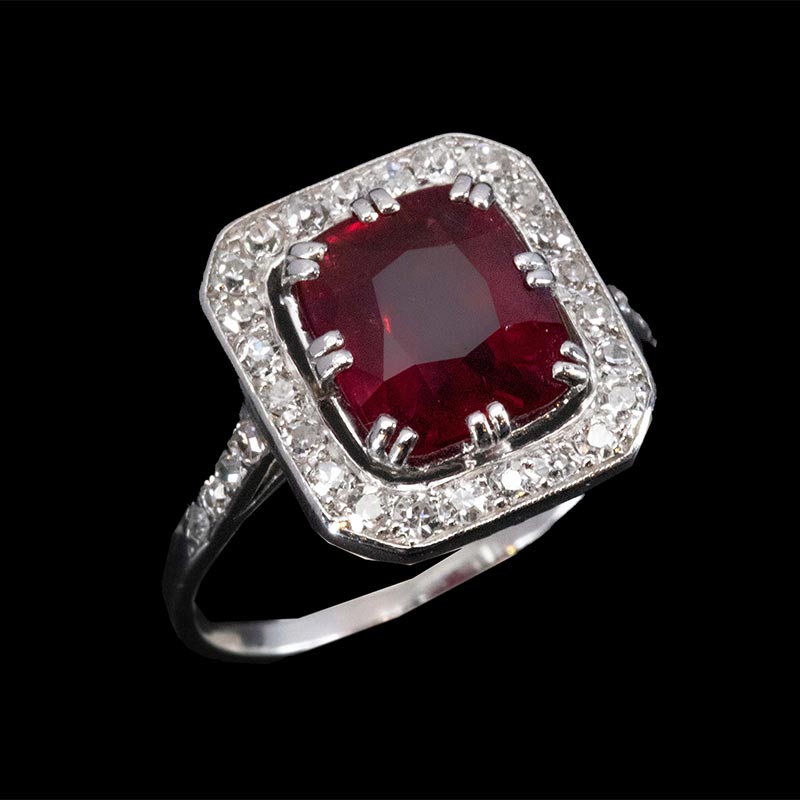 1920-1930年代法国出品装饰艺术风格铂金镶嵌缅甸无烧红宝石及钻石戒指