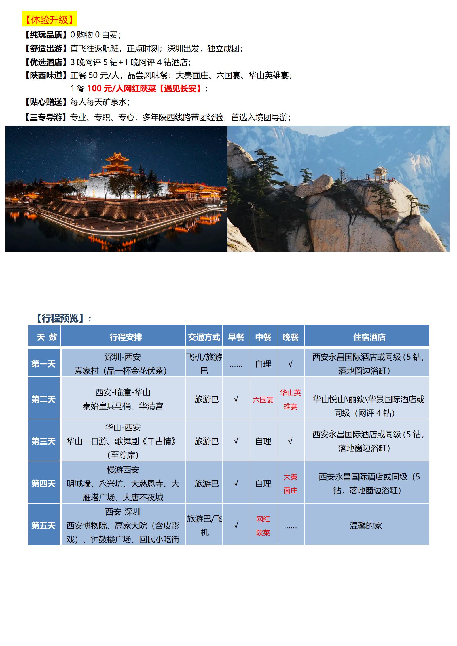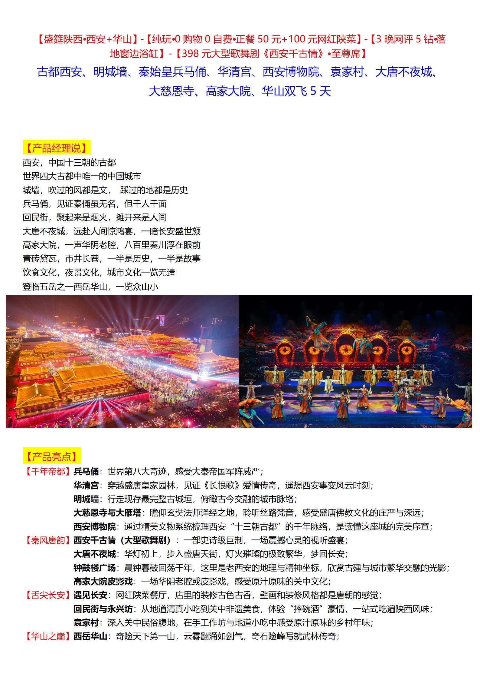 【五一】<陕西西安+华山5天纯玩团>《西安千古情》、明城墙、秦始皇兵马俑、华清宫、西安博物院、袁家村、大唐不夜城、大慈恩寺、高家大院、3晚5钻酒店
