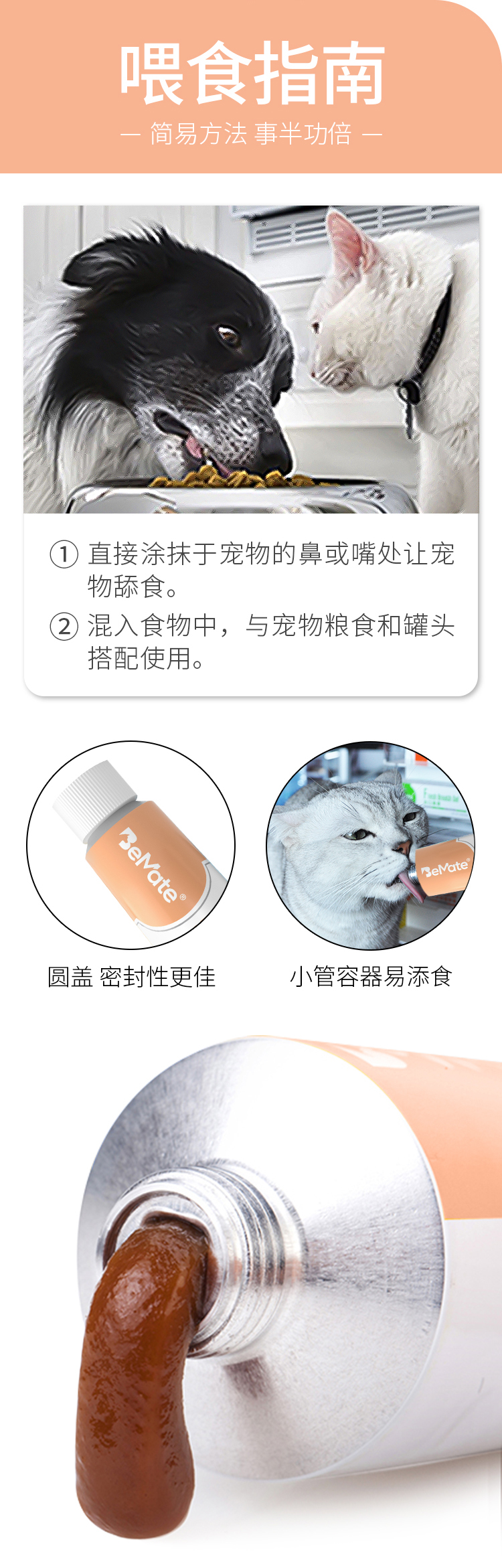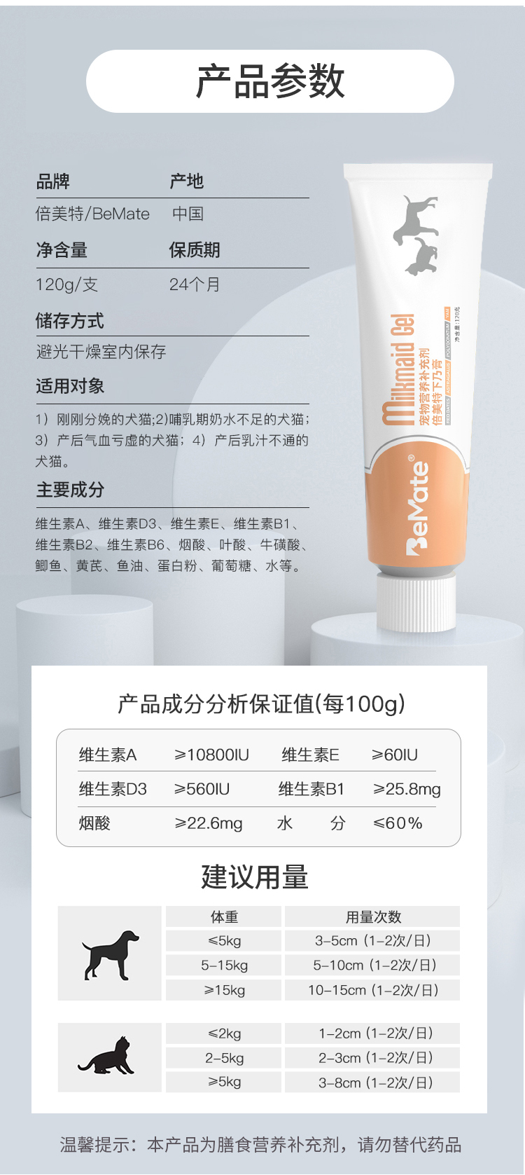 BeMate倍美特 下乃膏120g/支 主要成分:维生素A、维生素D3、维生素E、维生素B1、维生素B2、维生素B6、烟酸、叶酸、牛磺酸,鲫鱼、黄芪、鱼油、蛋白粉、葡萄糖、水等。