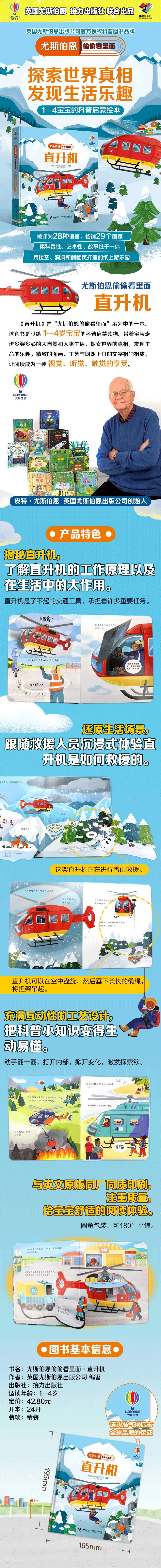 本书是尤斯伯恩偷偷看里面系列新书,这本书以孩子喜爱的直升机为主题,轻松易懂的科普内容,带着孩子去揭秘直升机,了解它的内部结构及起飞、降落等工作原理。用再现直升机救援的全过程,来让孩子体会直升机在我们生活中的作用。