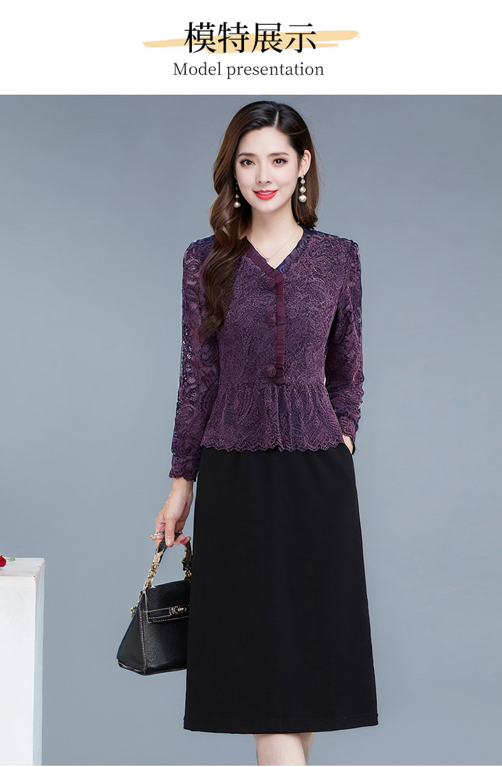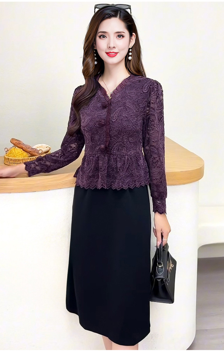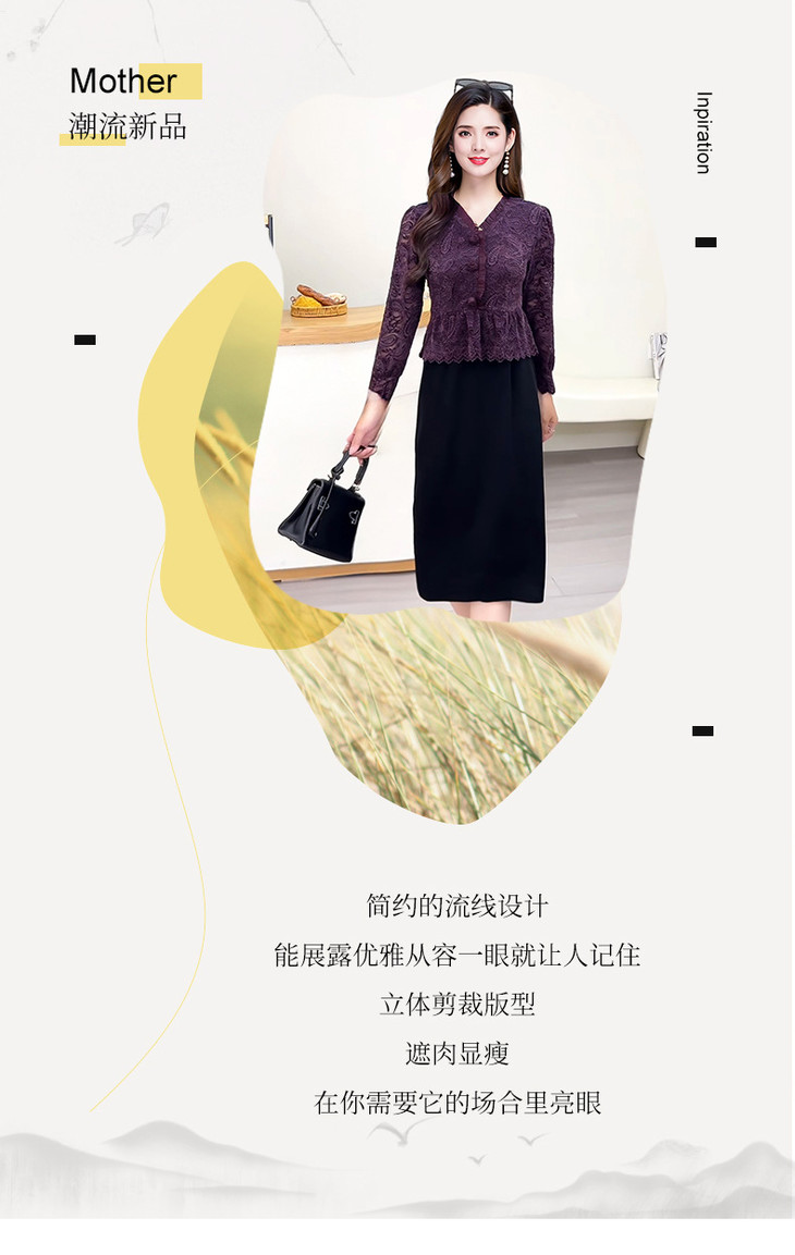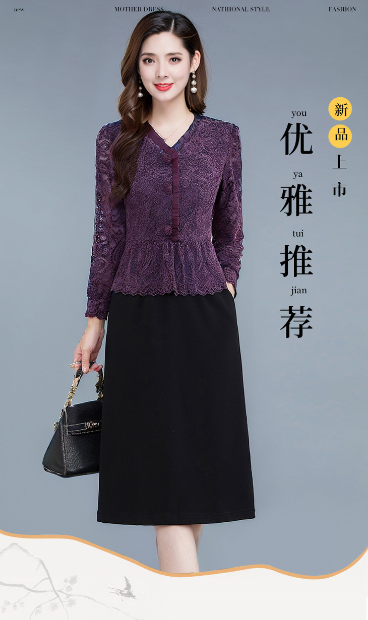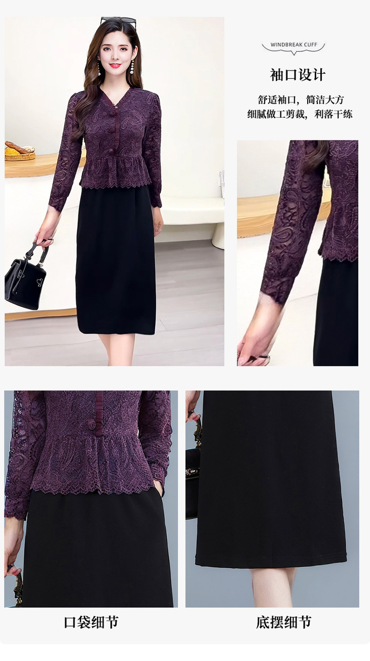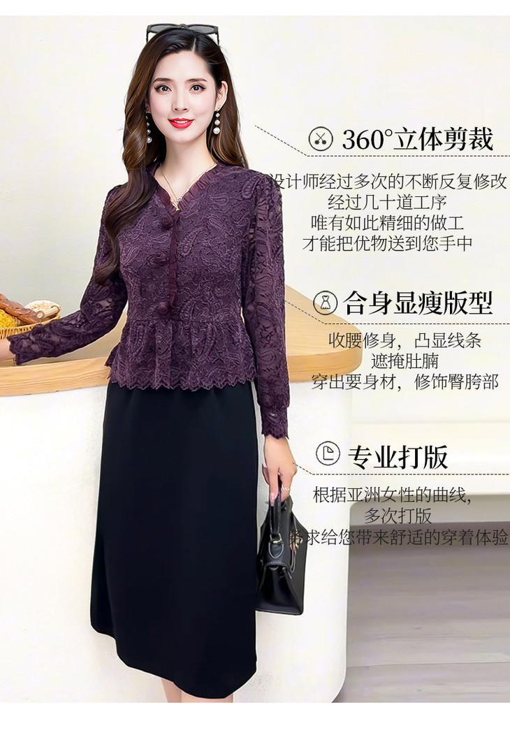 V领蕾丝拼接假两件连衣裙,气质优雅中年妈妈裙子QYM-YJ25B270
