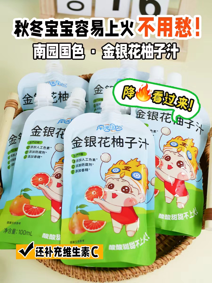 宝宝不爱吃饭?口干舌燥?嘴角起泡?大便干燥? 给宝宝喝这款柚子汁正合适! 1.金银花+西柚,天然温和、清爽滋润; 2.可以每天喝的金银花果汁,每天一袋,不怕火火; 3.健康不添加,优选好原料,不添加色素、防腐剂、香精! 4.富含维生素C,每日维生素补给站。