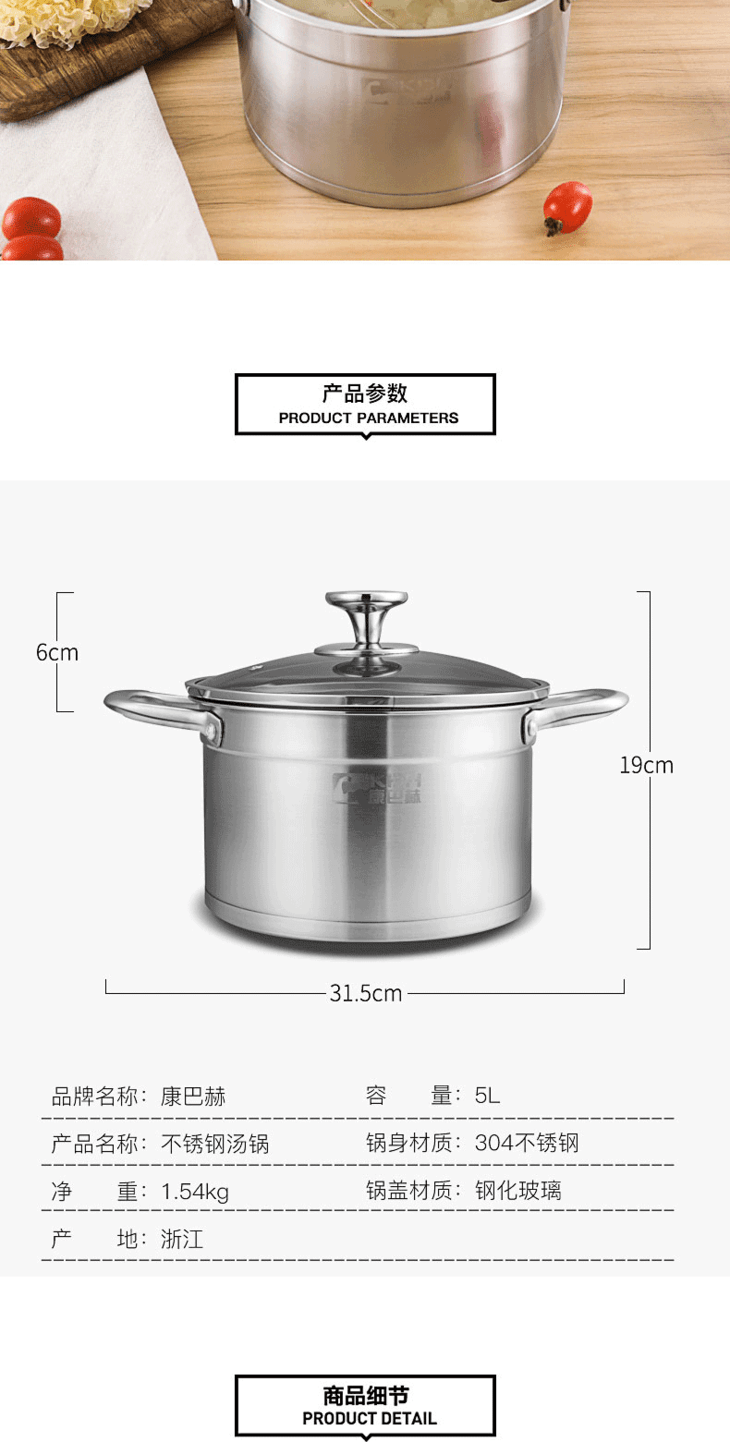 康巴赫汤锅加厚304不锈钢熬汤奶锅泡面辅食锅燃气电磁炉通用家用