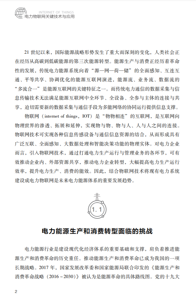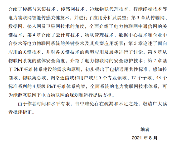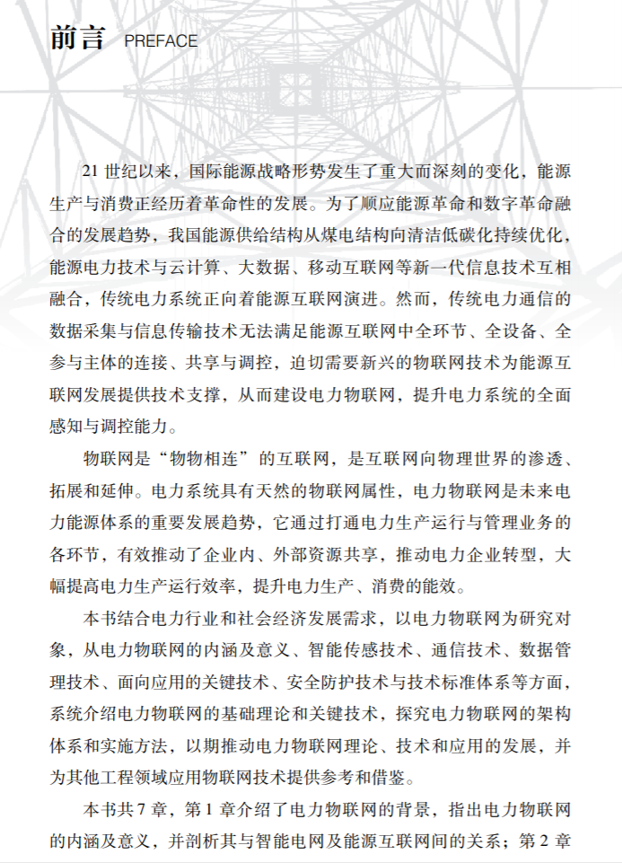 全书共 7 章,第 1 章为概述,第 2~4 章分别对电力物联网智能传感技术、通信网关键技术及数据管理关键技术进行介绍与论述,并进行了应用分析及展望;第 5 章对电力物联网面向应用的关键技术进行了论述;第 6 章介绍了电力物联网安全防护技术;第 7 章初步提出了电力物联网技术标准体系构架。